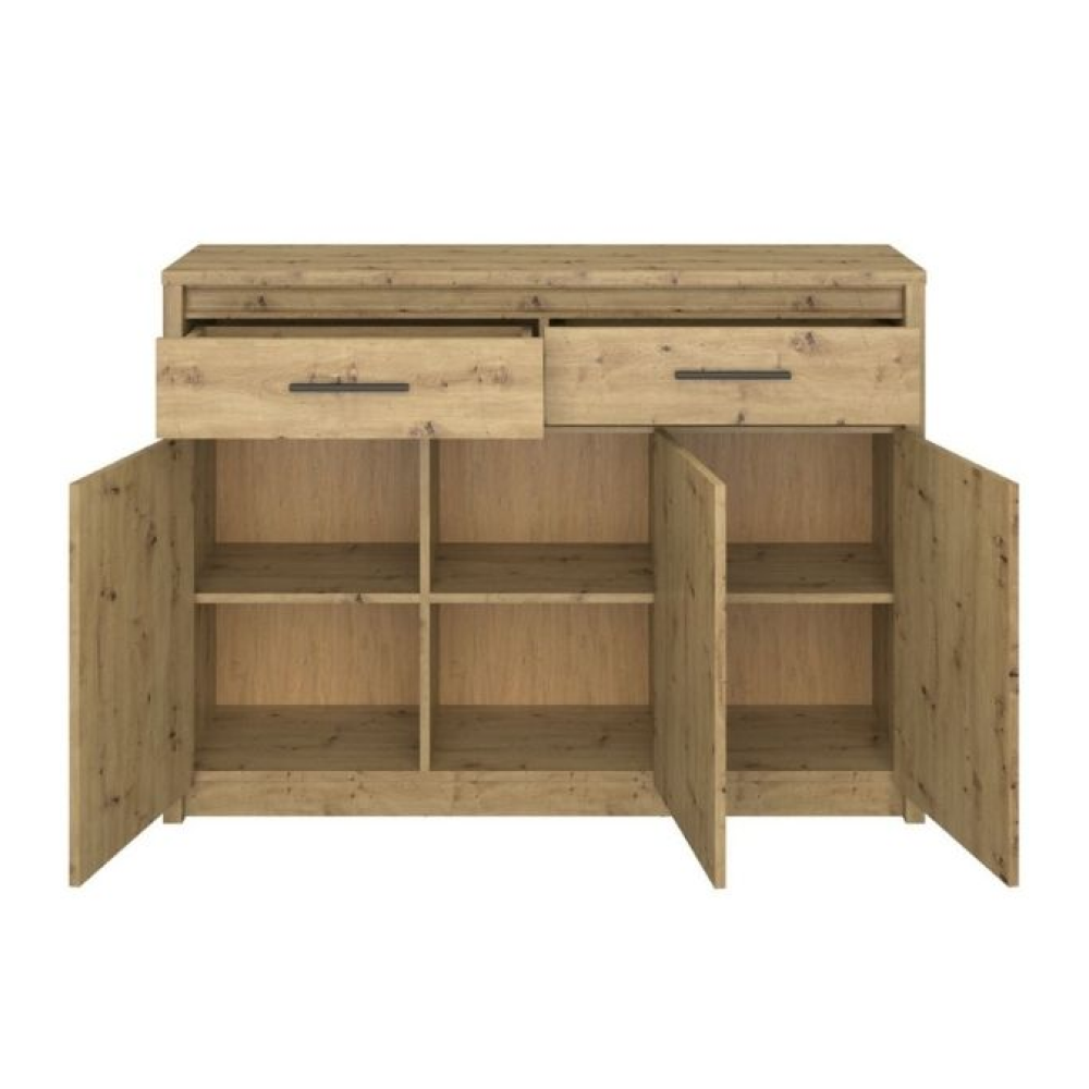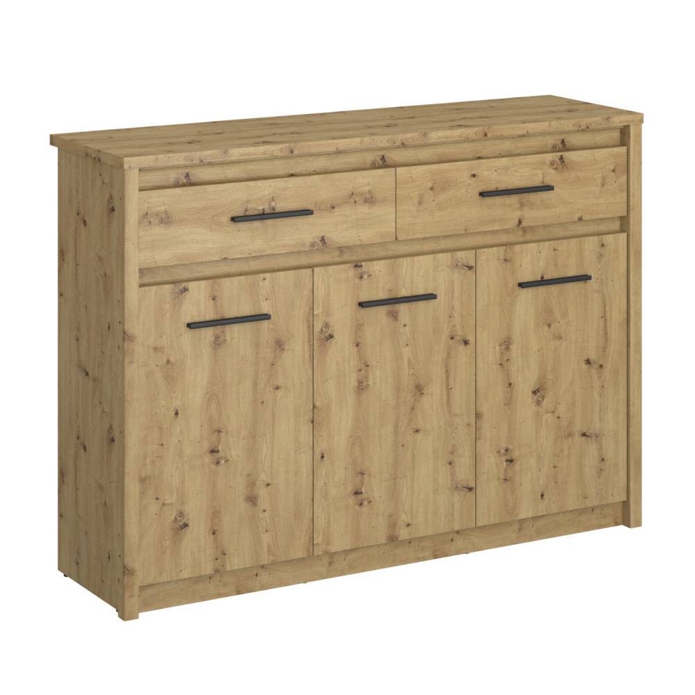Materiál: DTD laminovaná/ABS hranyFarba: dub artisanRozmery (ŠxHxV): 125,4x36,2x91,2 cmHrúbka materiálu: 1,6-3,2 cmPlastové úchytkyFarba úchytiek: čiernaTrojdverováDva šuplíkyNosnosť šuplíka: 5 kgVýška šuplíka: 15,1 cmPlastové nožičkyModerný dizajnOdporúčame pripevniť k steneDodávané v demonte