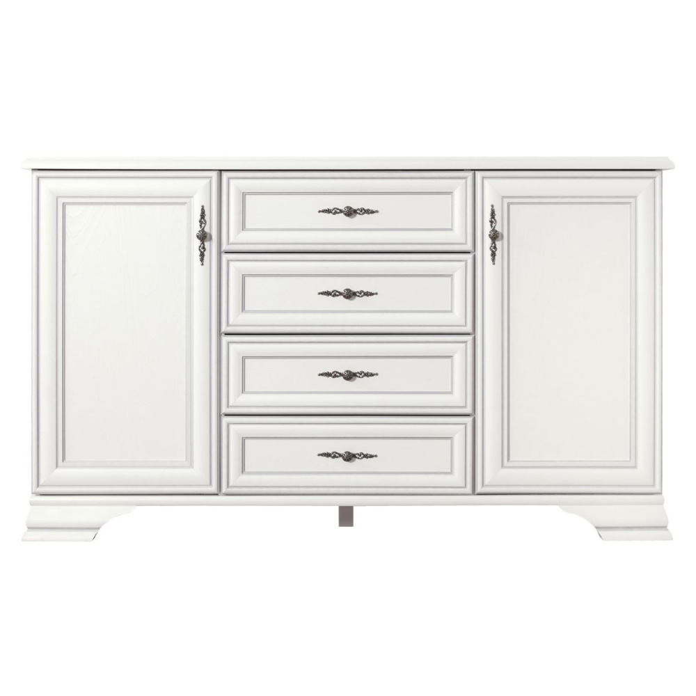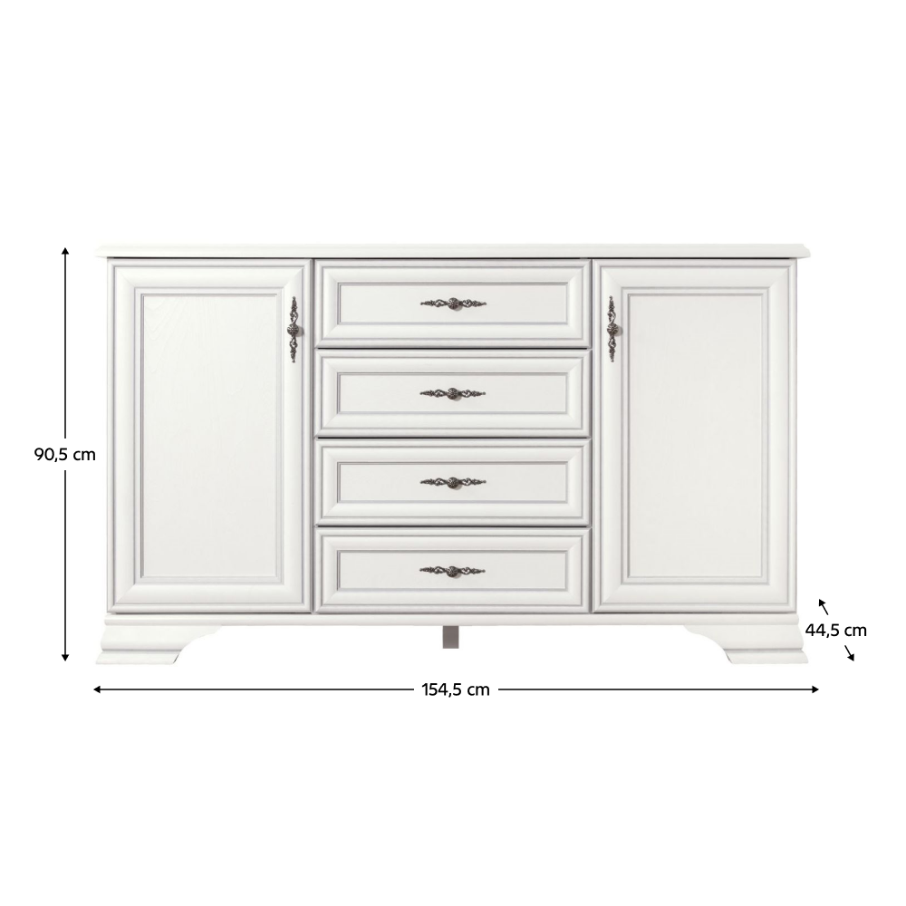 Materiál: DTD laminovanáFarba: alpská bielaRozmery (ŠxHxV): 154,5x44,5x90,5 cmHrúbka materiálu: 1,6 cmKovové úchytkyFarba úchytiek: antické striebroŠuplíkyNosnosť šuplíka: 3 kgDvojdverováPoliceNosnosť police: 4 kgNosnosť vrchnej dosky: 15 kgNa nožičkáchVýška nožičiek: 8 cmDodávané v demonte