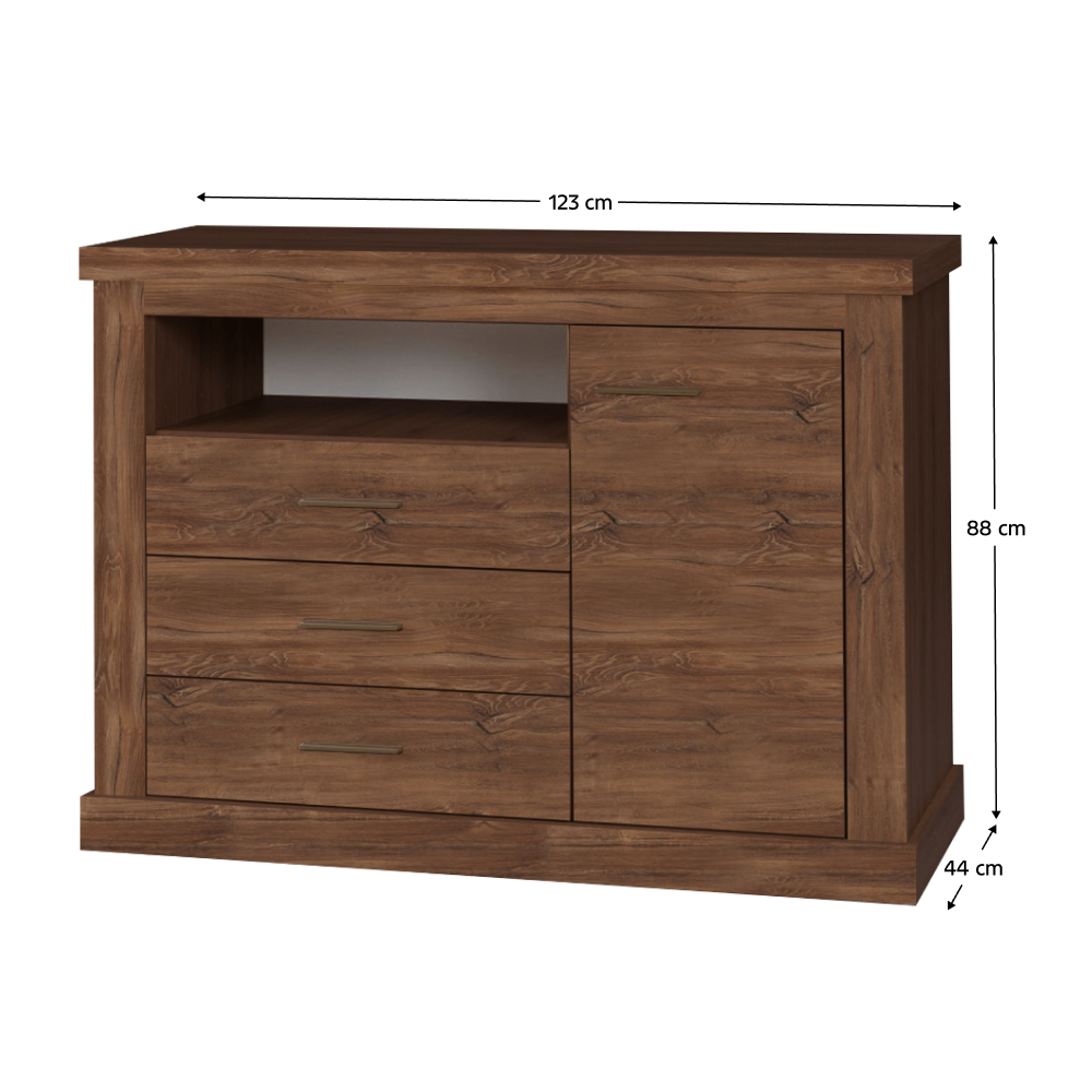 Materiál: DTD laminovaná/ABS hranyFarba: dub stirlingRozmery (ŠxHxV): 123x44x88 cmHrúbka materiálu: 50 mm3D efektKovové úchytkyABS hranyTri šuplíkySkrinkaOtvorený priestorDodávané v demonte