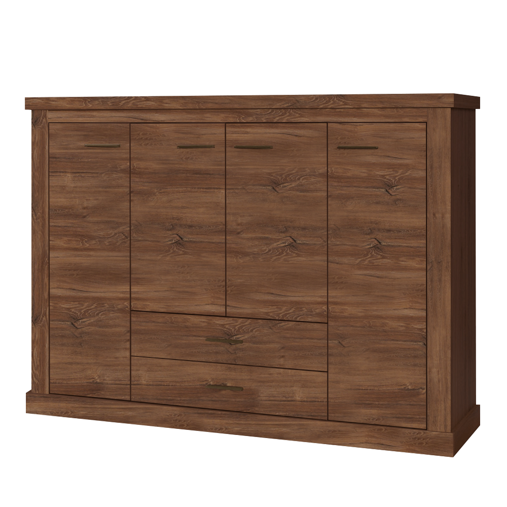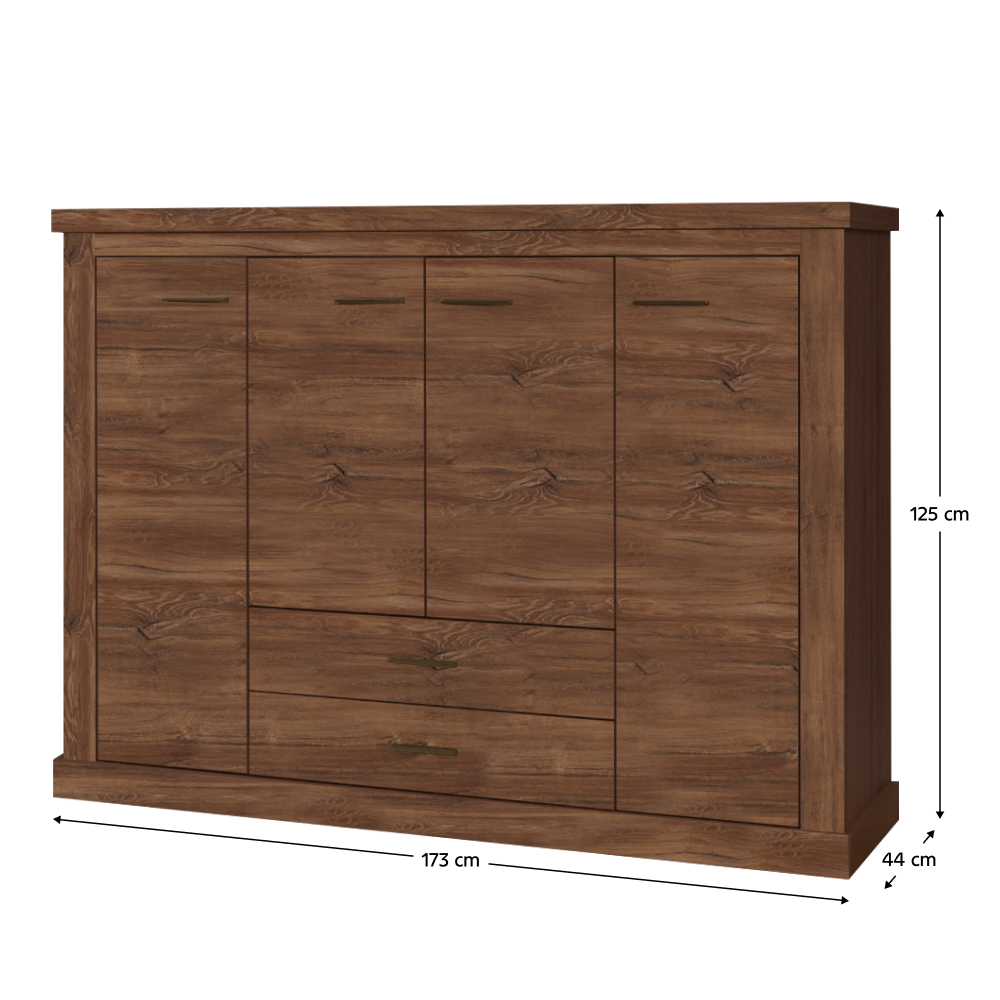 Materiál: DTD laminovaná/ABS hranyFarba: dub stirlingRozmery (ŠxHxV): 173x44x125 cmHrúbka materiálu: 50 mm3D efektKovové úchytkyABS hranyDva šuplíkyTri skrinkyDodávané v demonte