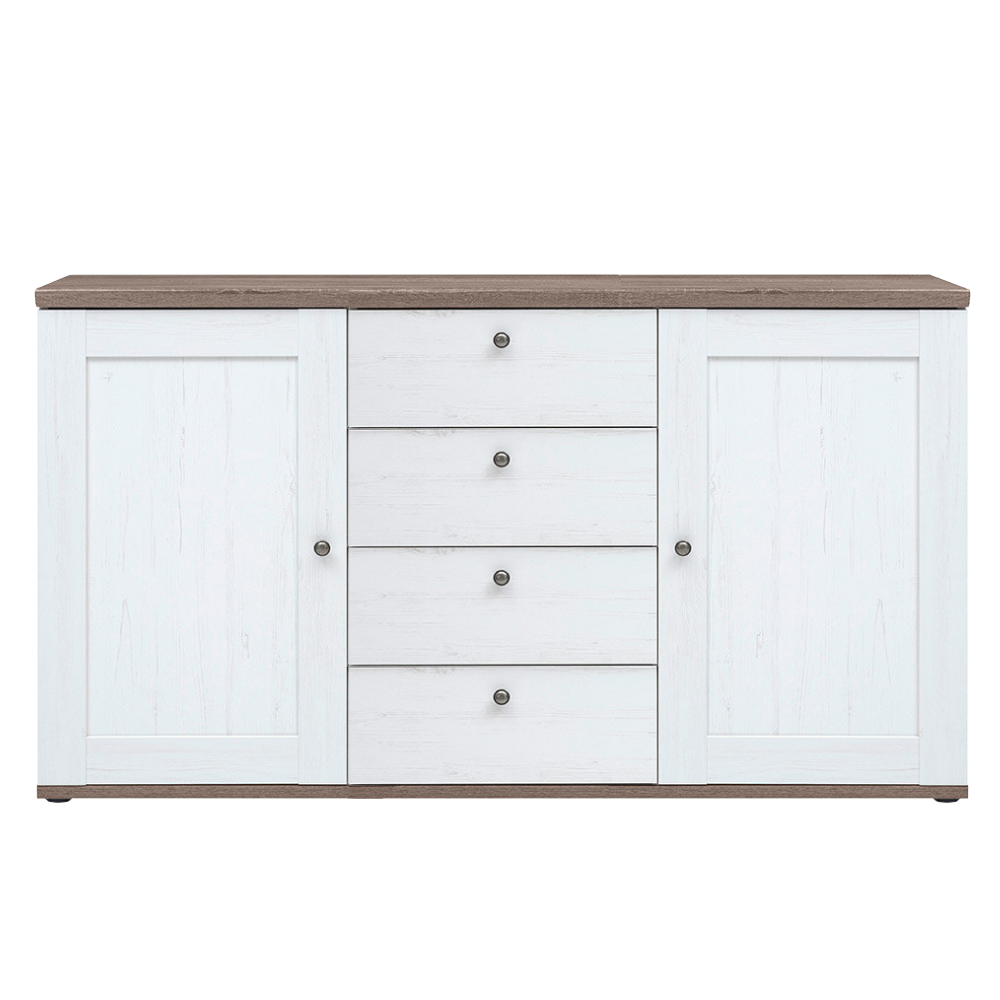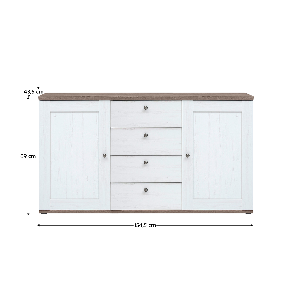 Materiál: laminovaná DTDFarba: borovica canyon/dub sonoma trufelRozmery (ŠxHxV): 154,5x43,5x89 cmHrúbka materiálu: 1,6 cmS úchytkamiMateriál úchytiek: kovFarba úchytiek: staré striebro4 šuplíkyNosnosť šuplíka: 3 kgDvojdverová2 skrinkyPolicováNosnosť police: 5 kgModerný dizajnOdporúčame pripevniť k steneDodávané v demonte