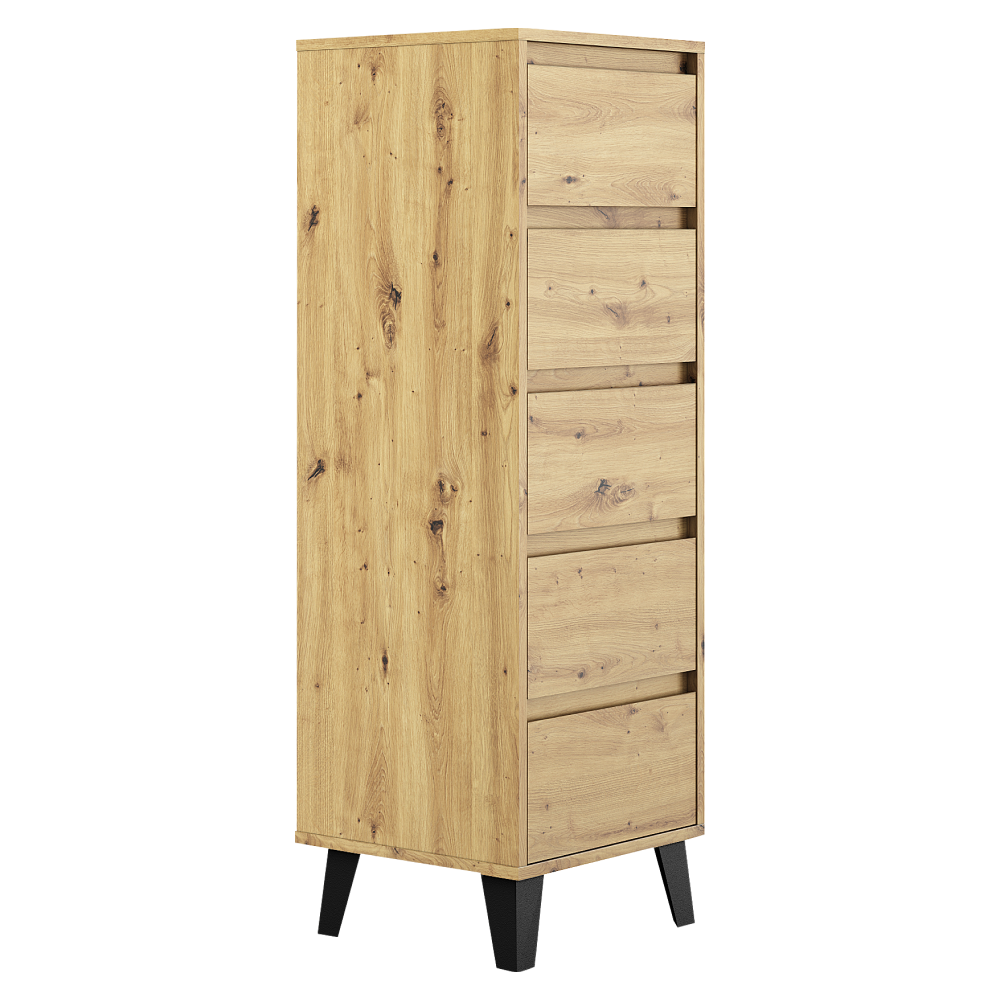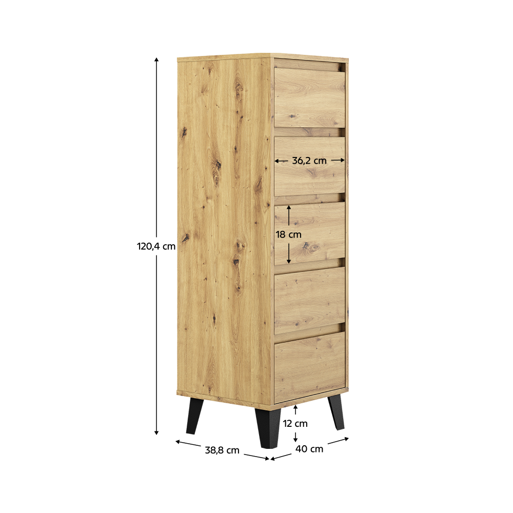 Materiál: laminovaná DTDFarba: dub artisanRozmery (ŠxHxV): 40x38,8x120,4 cmVýška spodného priestoru od podlahy: 12 cmPäť šuplíkovRozmer šuplíka (ŠxV): 36,2x18 cmVnútorný rozmer šuplíka (ŠxHxV): 30,8x33,3x9 cmNa nožičkáchFarba nožičiek: čiernaNosnosť šuplíka: 5 kgNosnosť vrchnej dosky: 15 kgModerný štýlBez úchytiekOdporúčame pripevniť k steneDodávané v demonte