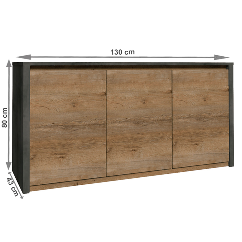 Komoda K3D, MONTANAMateriál: DTD laminovaná, ABS hranyFarebné prevedenie: dub lefkas tmavý/smooth sivýRozmery (ŠxHxV): 130x43x80 cm. Hrúbka materiálu: 15 mmDodávané v demonte.