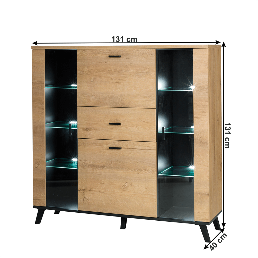 Materiál: DTD laminovaná/plastFarba: dub lefkas/čiernaRozmery (ŠxHxV): 131x40x131 cmVýška spodného priestoru od podlahy: 12 cmMnožstvo úložného priestoruDve sklené vitrínyABS hranyPlastové nožičkyModerný štýlDodávané bez LED osvetleniaMožnosť dokúpiť LED osvetlenieDodávané v demonte