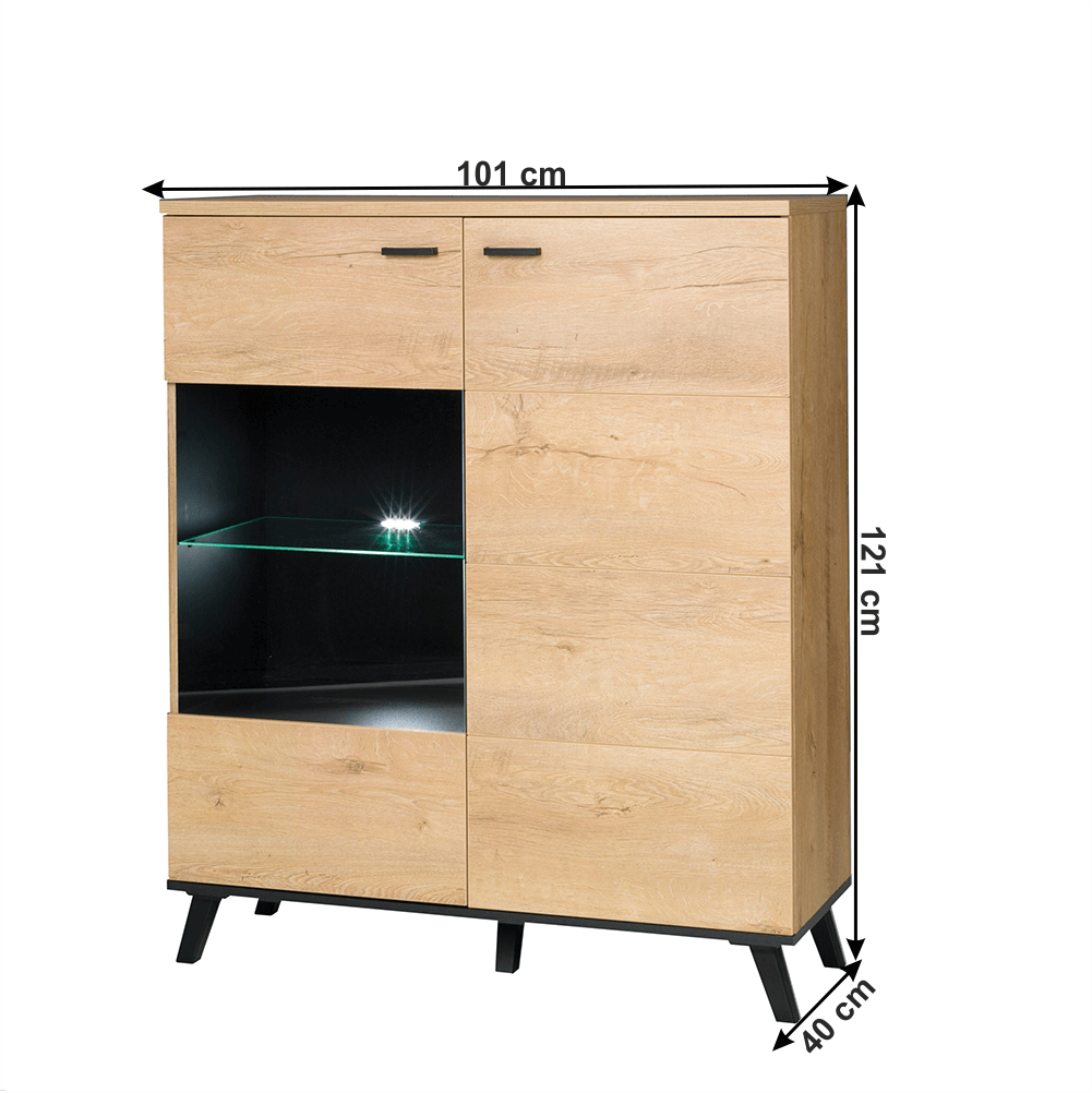 Materiál: DTD laminovaná/plastFarba: dub lefkas/čiernaRozmery (ŠxHxV): 101x40x121 cmVýška spodného priestoru od podlahy: 12 cmDvojdverová komodaABS hranyPlastové nožičkyModerný štýlDodávané bez LED osvetleniaMožnosť dokúpiť LED osvetlenieDodávané v demonte