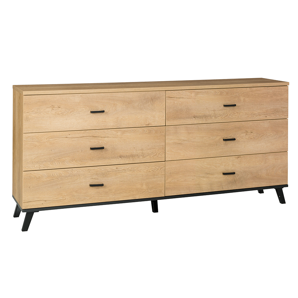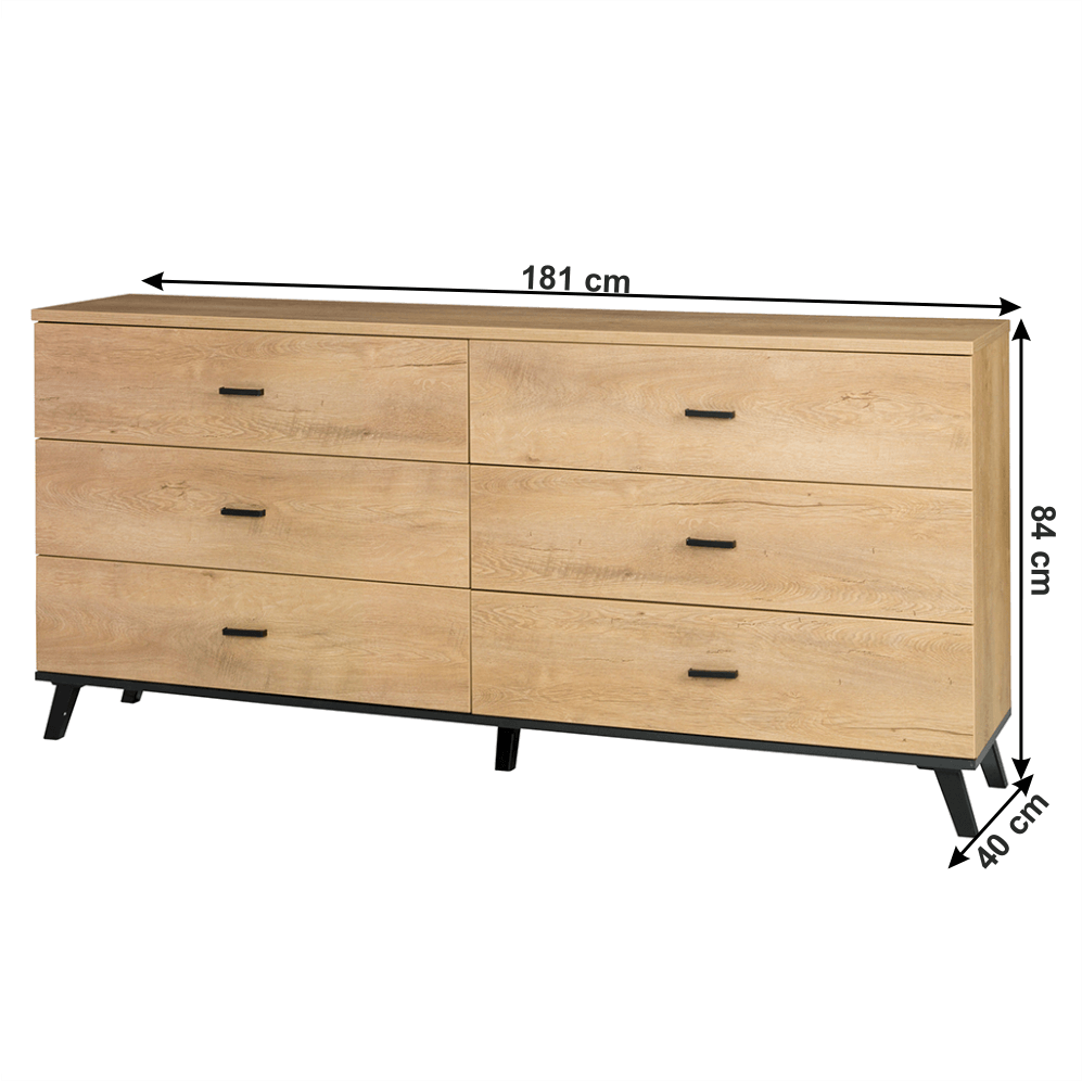 Materiál: DTD laminovaná/plastFarba: dub lefkas/čiernaRozmery (ŠxHxV): 181x40x84 cmVýška spodného priestoru od podlahy: 12 cmŠesť šuplíkovABS hranyPlastové nožičkyModerný štýlMožnosť dokúpiť policeDodávané v demonte
