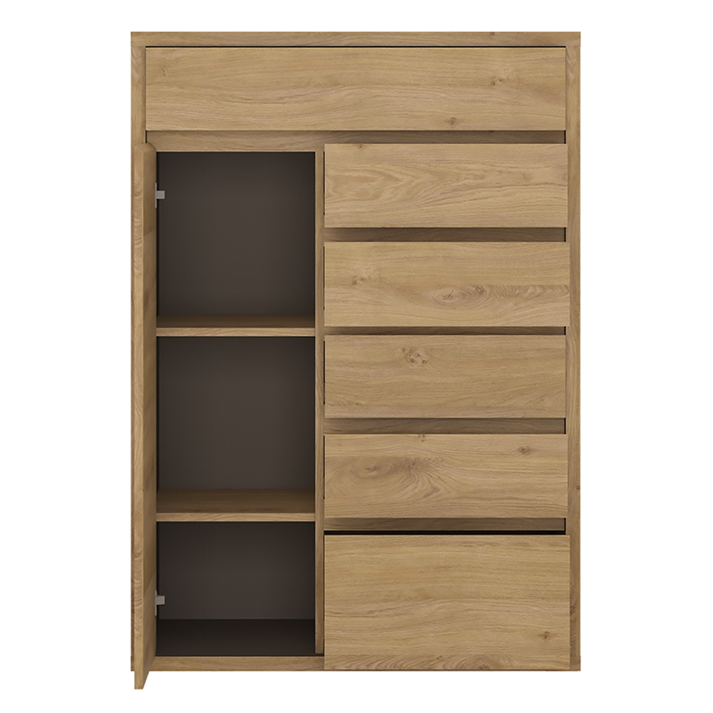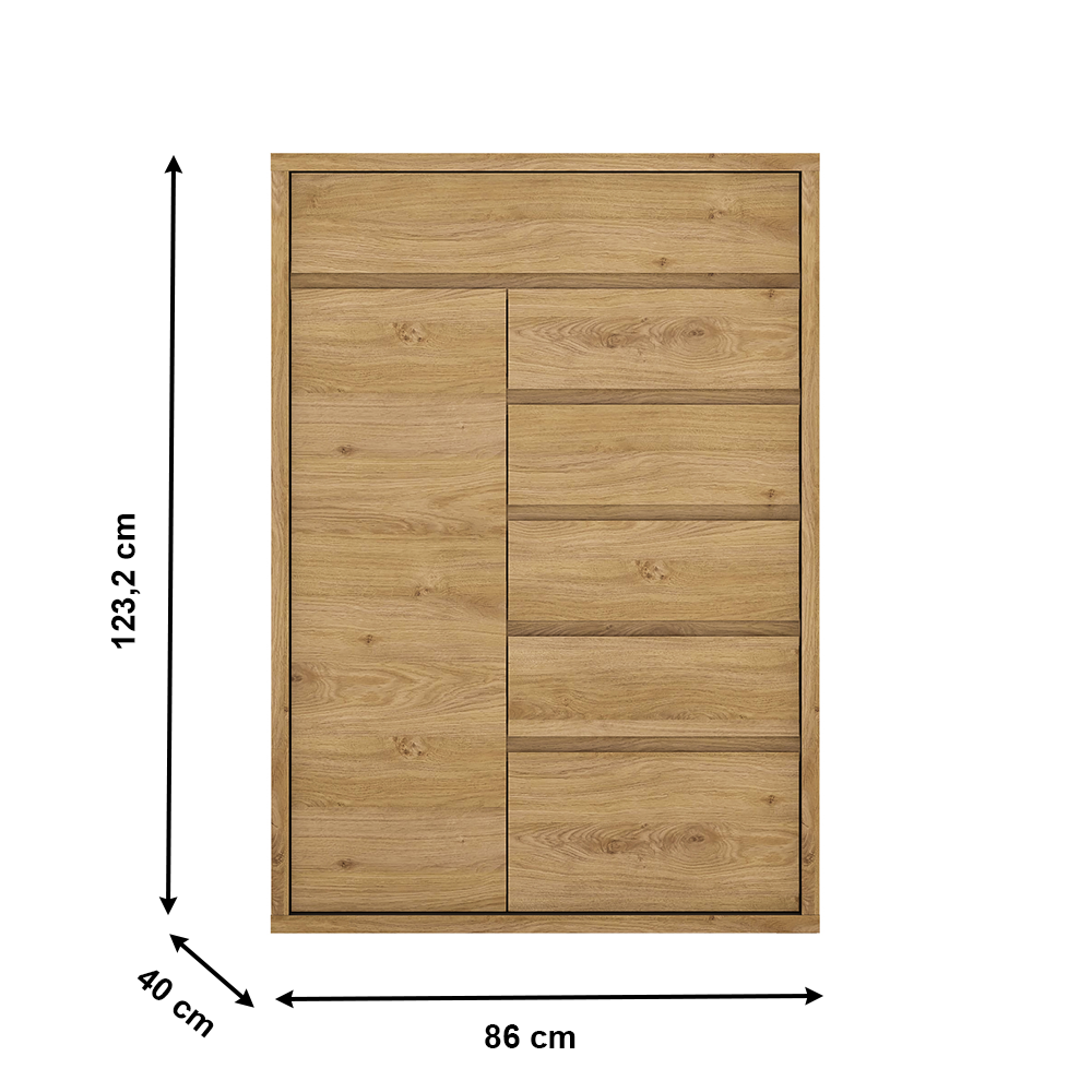 Materiál: laminovaná DTDFarebné prevedenie: dub Shetland/siváRozmery (ŠxHxV): 86x40x123,2 cmHrúbka korpusu: 2,8 cmBez úchytkováJednoduchá a elegantnáHrubý korpus6 šuplíkov2 poličkyModerný štýlVysoká kvalitaPrecízne spracovanieOdolná voči poškriabaniu, UV žiareniu, vysokým teplotámNosnosť poličky: 5 kgNosnosť šuplíka: 5 kgDodávané v demonte