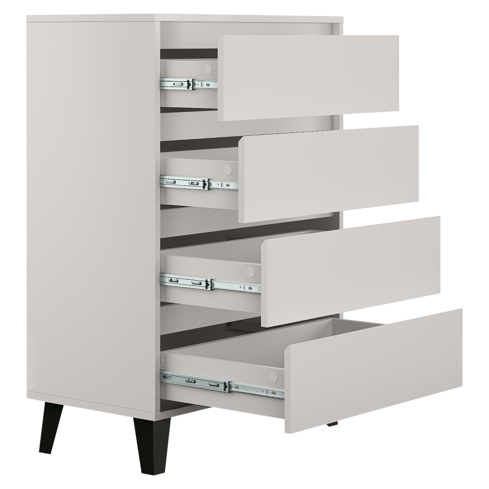 Materiál: laminovaná DTDFarba: kašmírRozmery (ŠxHxV): 70x38,8x99,4 cmVýška spodného priestoru od podlahy: 12 cmŠtyri šuplíkyRozmer šuplíka (ŠxV): 66,2x18 cmVnútorný rozmer šuplíka (ŠxHxV): 60,8x33,3x9 cmNa nožičkáchFarba nožičiek: čiernaNosnosť šuplíka: 5 kgNosnosť vrchnej dosky: 15 kgModerný štýlBez úchytiekOdporúčame pripevniť k steneDodávané v demonte