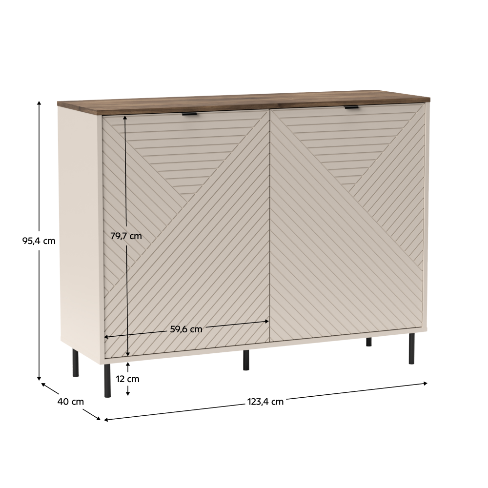 Materiál: laminovaná DTD/MDF/ABS hranyFarba: kašmír/dub castelloRozmery (ŠxHxV): 123,4x40x95,4 cmHrúbka materiálu: 1,6 cmDvojdverováDve skrinkyRozmery skrinka (ŠxV): 59,6x79,7 cmPolicaS úchytkamiMateriál úchytiek: kovFarba úchytiek: čiernaNa nožičkáchMateriál nožičiek: kovFarba nožičiek: čiernaVýška nožičiek: 12 cmNosnosť vrchnej dosky: 10 kgNosnosť police: 5 kgDekoratívne dvierkaModerný dizajnOdporúčame pripevniť k steneDodávané v demonte