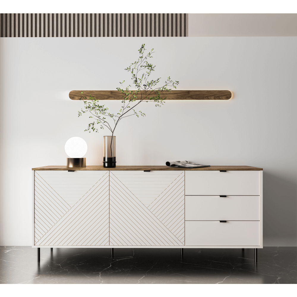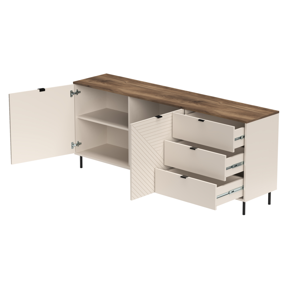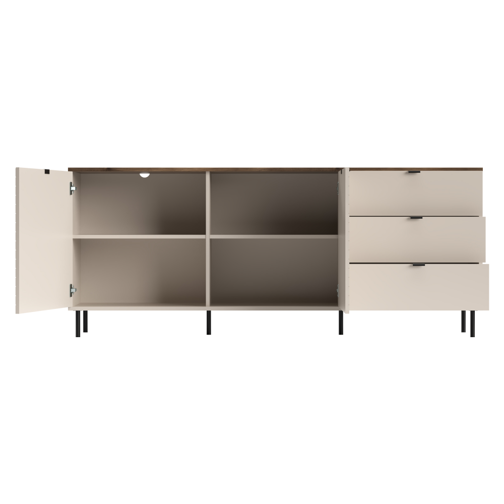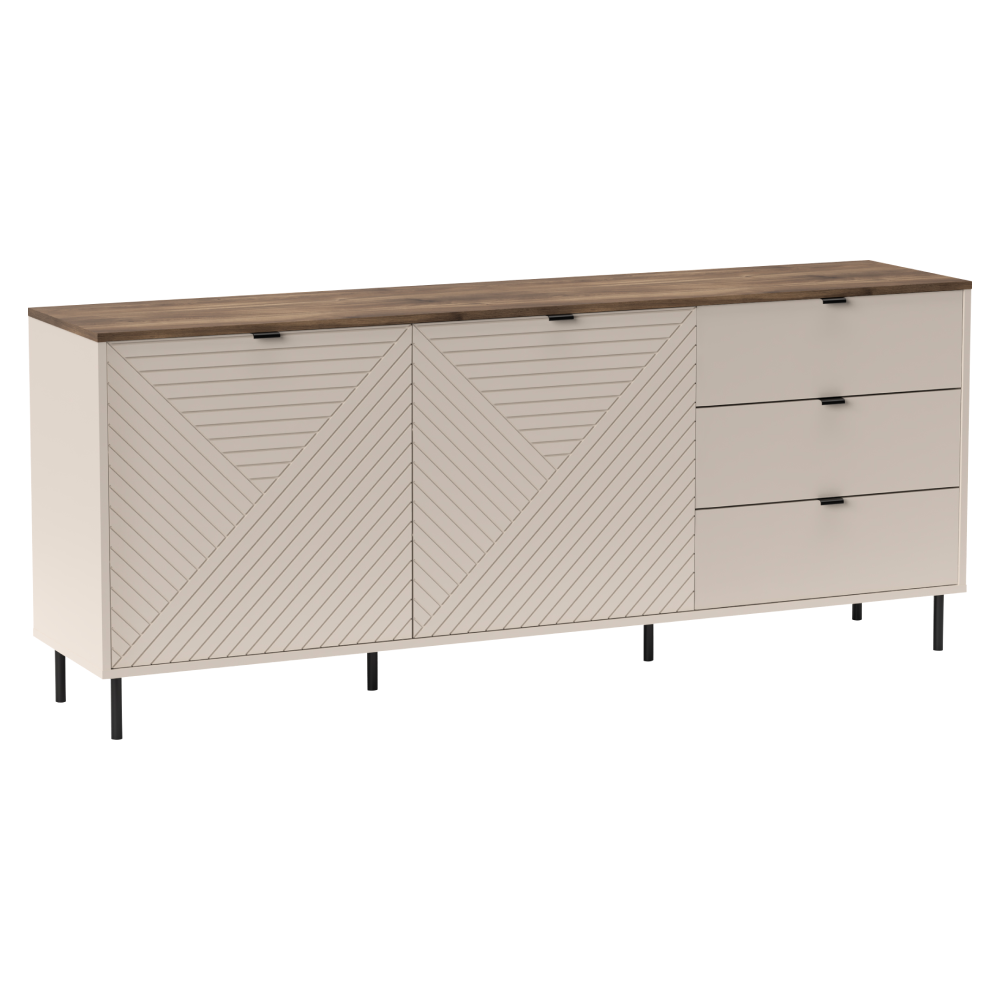 Materiál: laminovaná DTD/MDF/ABS hranyFarba: kašmír/dub castelloRozmery (ŠxHxV): 183,4x40x75,2 cmHrúbka materiálu: 1,6 cmDvojdverováDve skrinkyRozmery skrinka (ŠxV): 59,6x59,6 cmPolicaTri šuplíkyRozmery šuplík (ŠxV): 59,6x19,6 cmS úchytkamiMateriál úchytiek: kovFarba úchytiek: čiernaNa nožičkáchMateriál nožičiek: kovFarba nožičiek: čiernaVýška nožičiek: 12 cmNosnosť vrchnej dosky: 10 kgNosnosť police: 5 kgNosnosť šuplíka: 3 kgDekoratívne dvierkaModerný dizajnOdporúčame pripevniť k steneDodávané v demonte