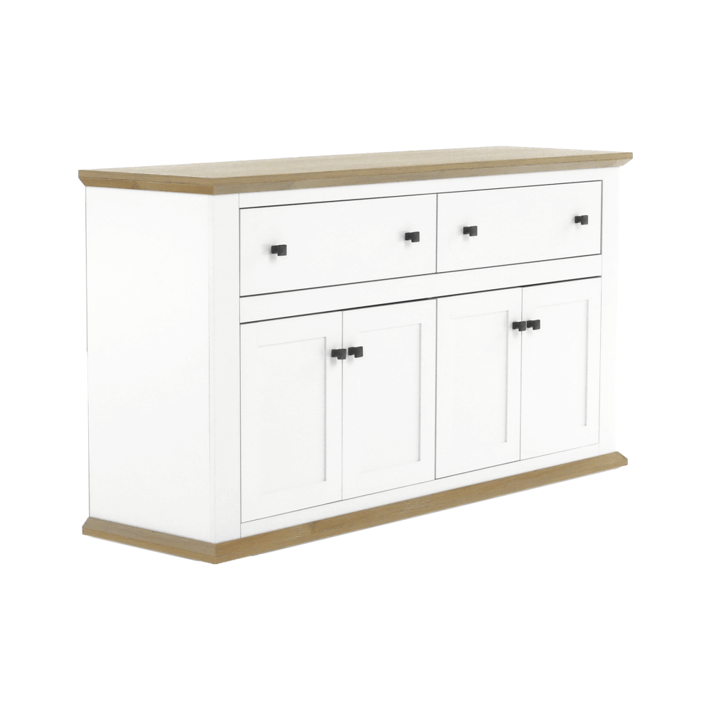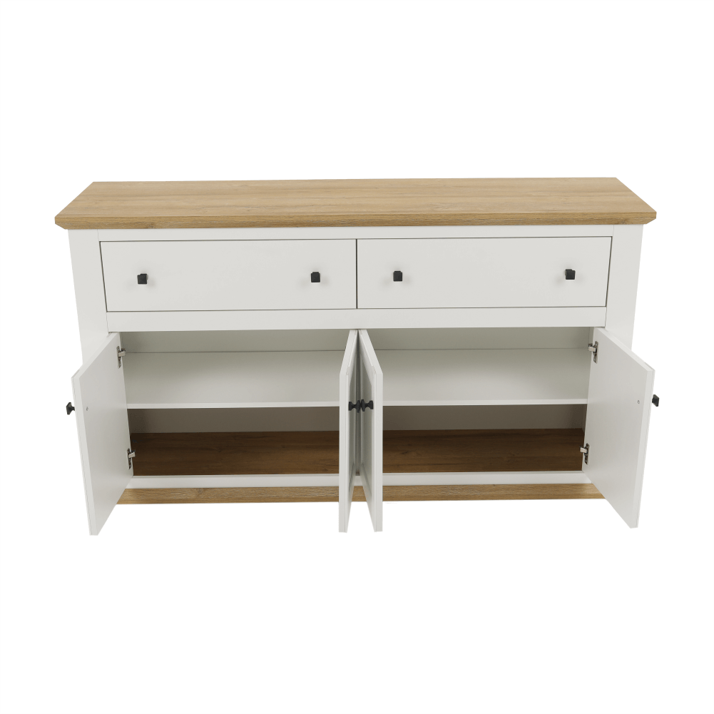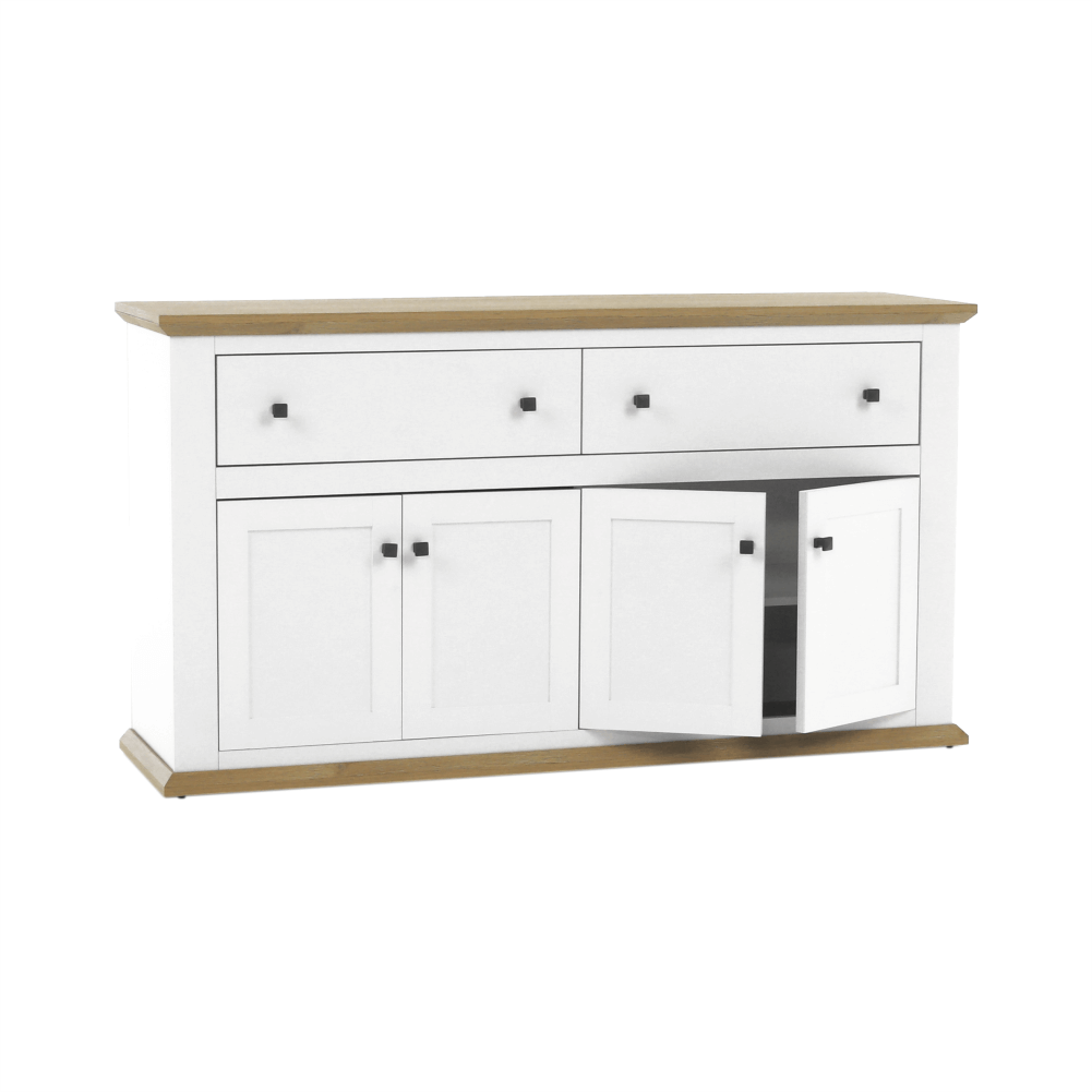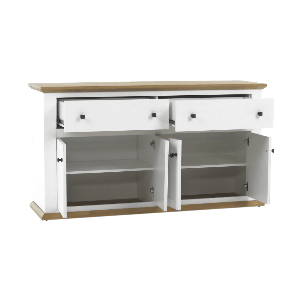 Materiál: DTD laminovaná/ABS hranyFarba: biela/dub grandRozmery (ŠxHxV): 160x45x87 cmHrúbka materiálu: 40 mmŠtvordverováŠtyri skrinkyDva šuplíkyS úchytkamiS 3D efektomElegantnýV provensálskom štýleKovové úchytkyDodávané v demonte