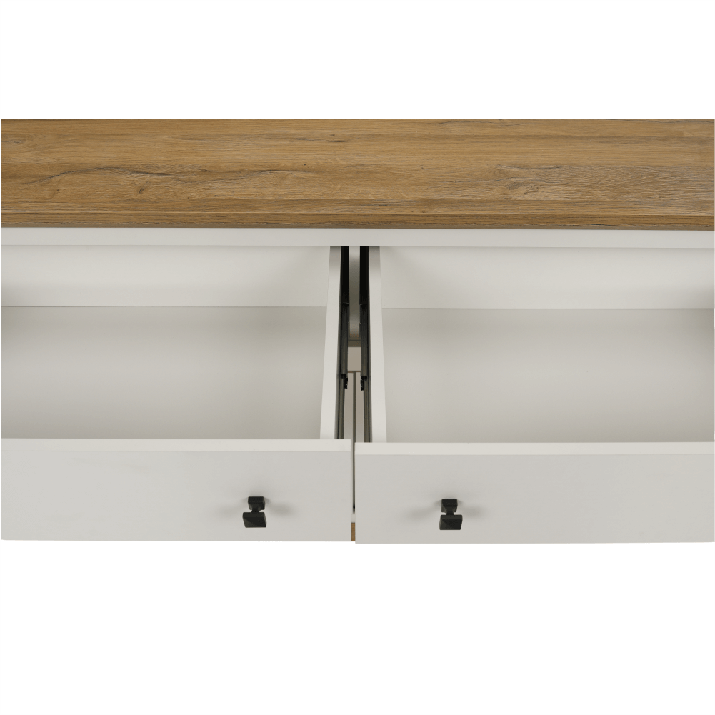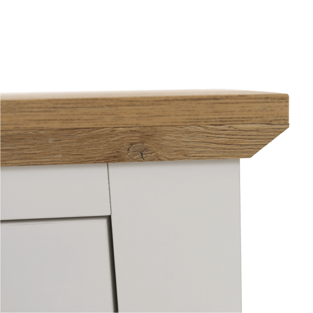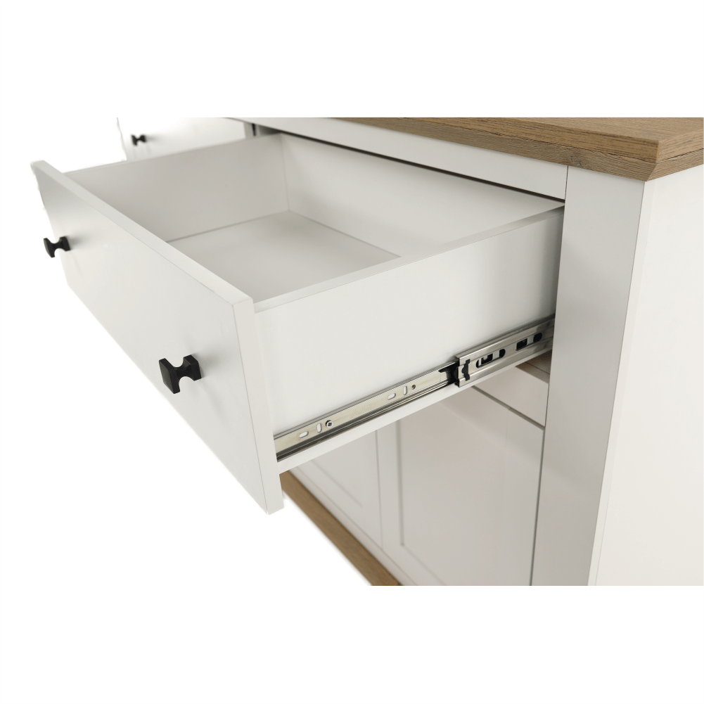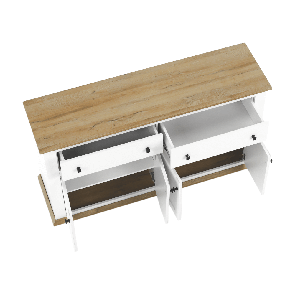 Materiál: DTD laminovaná/ABS hranyFarba: biela/dub grandRozmery (ŠxHxV): 160x45x87 cmHrúbka materiálu: 40 mmŠtvordverováŠtyri skrinkyDva šuplíkyS úchytkamiS 3D efektomElegantnýV provensálskom štýleKovové úchytkyDodávané v demonte