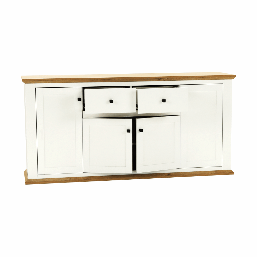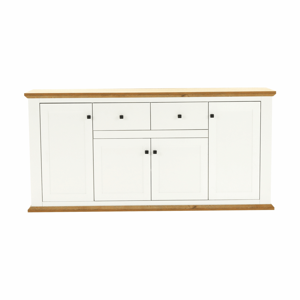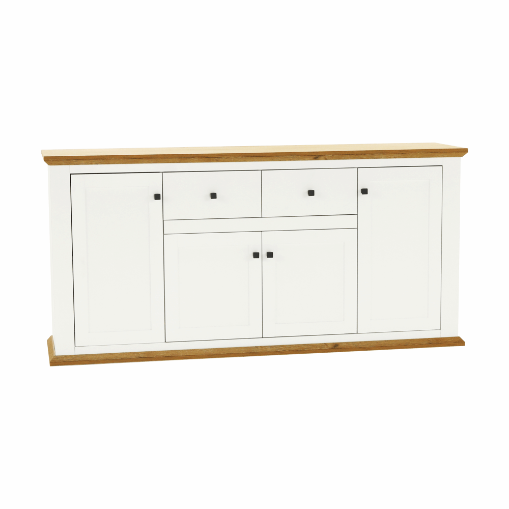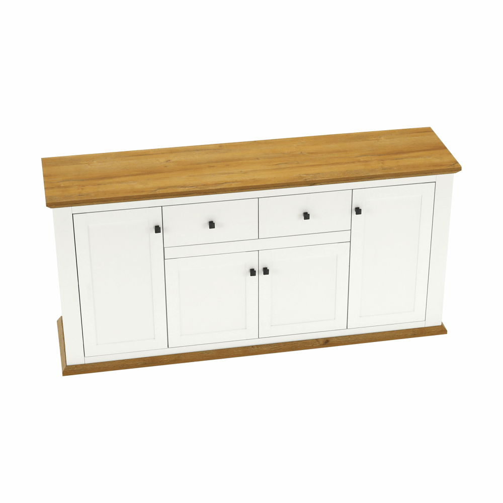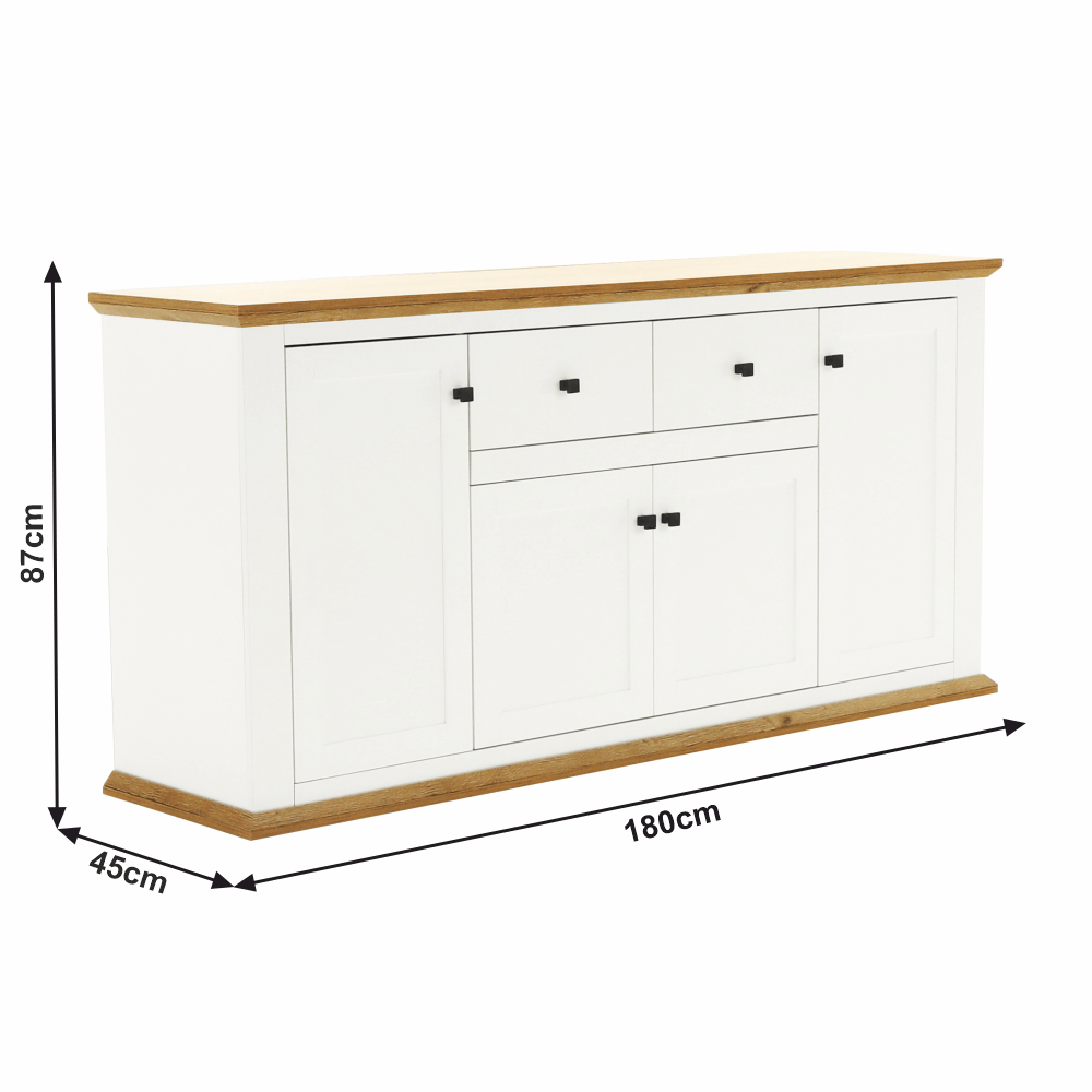 Materiál: DTD laminovaná / ABS hranyBarva: bílá / dub grandRozměry (ŠxHxV): 180x45x87 cmTloušťka materiálu: 40 mmčtyřdveřováčtyři skříňkydva šuplíkyS úchytkamiS 3D efektemelegantníV provensálském stylukovové úchytkyDodávané v demontu