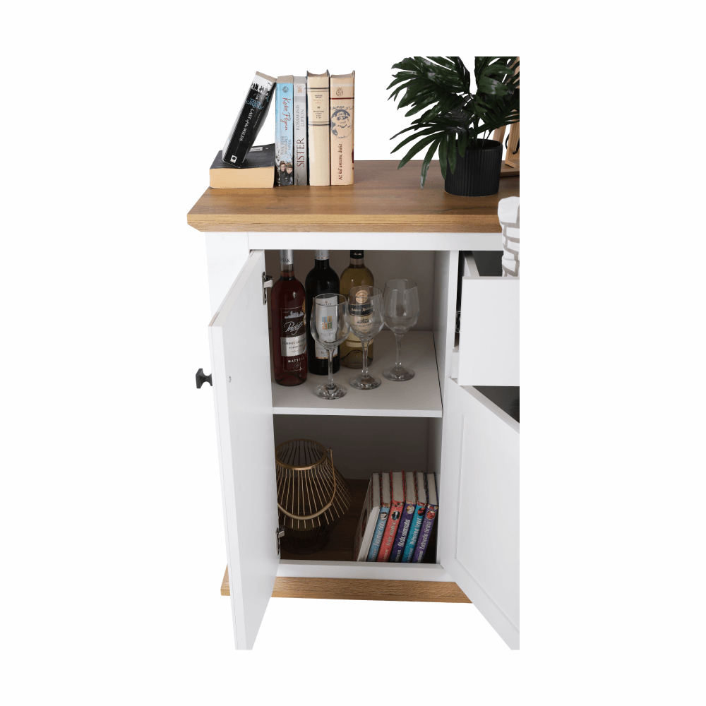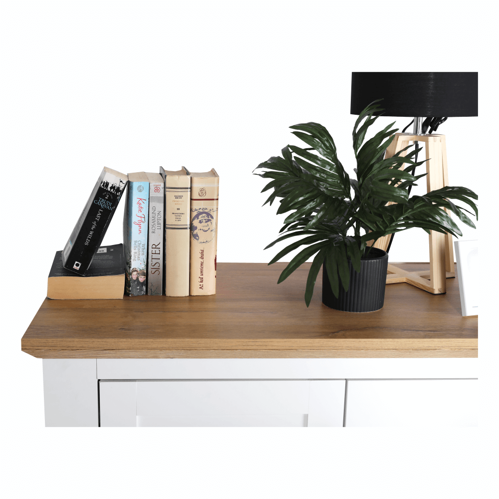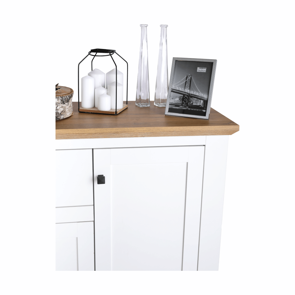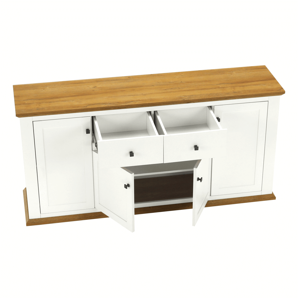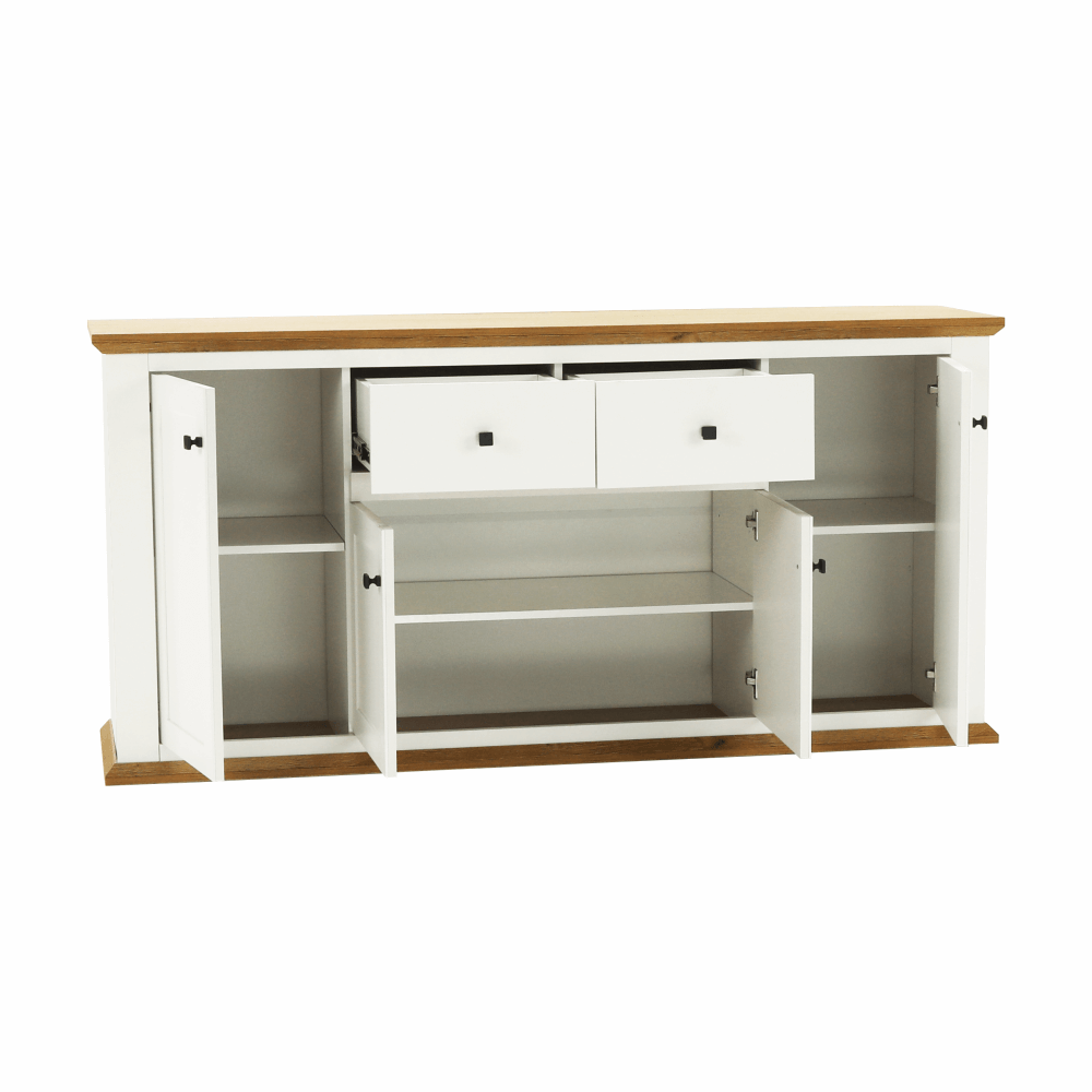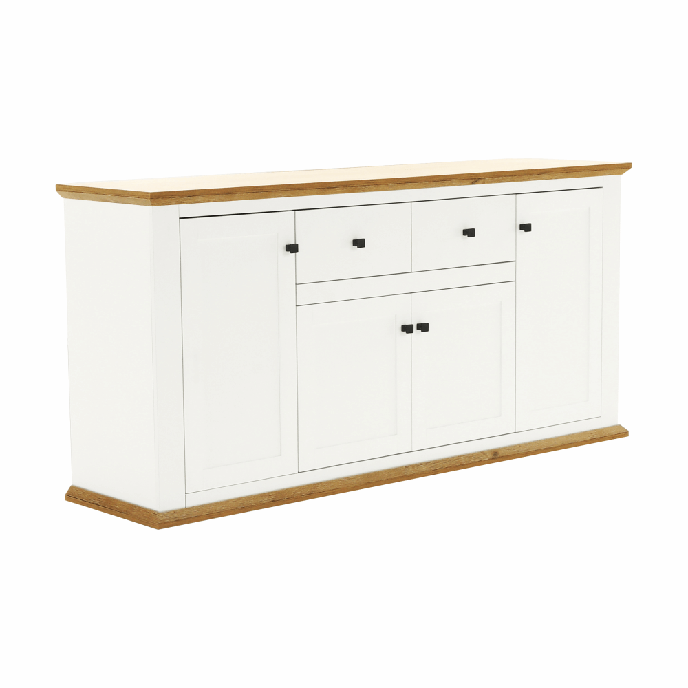 Materiál: DTD laminovaná / ABS hranyBarva: bílá / dub grandRozměry (ŠxHxV): 180x45x87 cmTloušťka materiálu: 40 mmčtyřdveřováčtyři skříňkydva šuplíkyS úchytkamiS 3D efektemelegantníV provensálském stylukovové úchytkyDodávané v demontu
