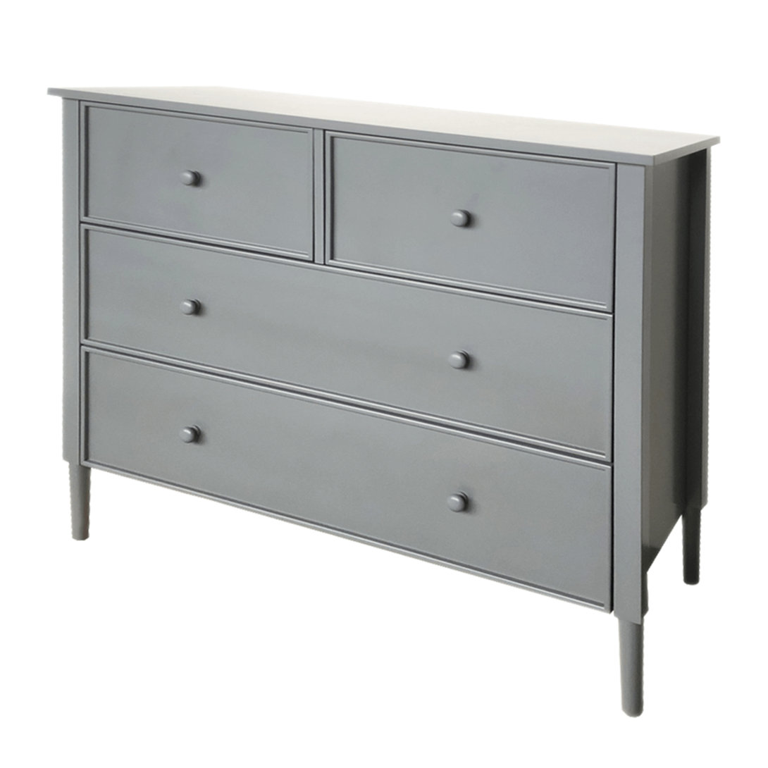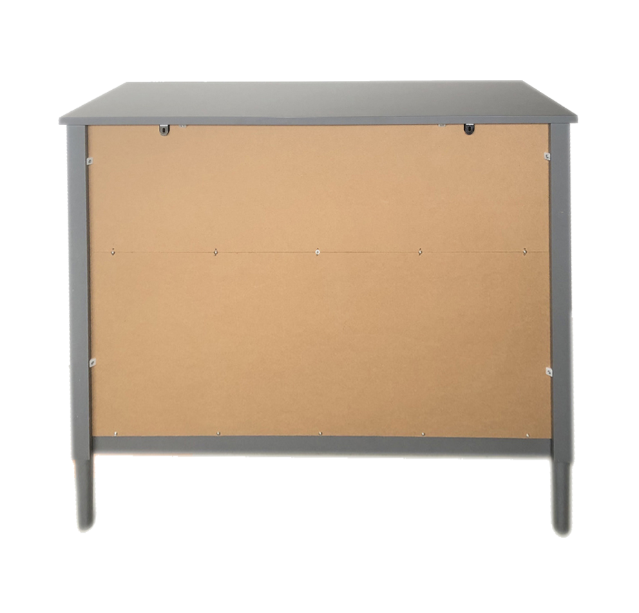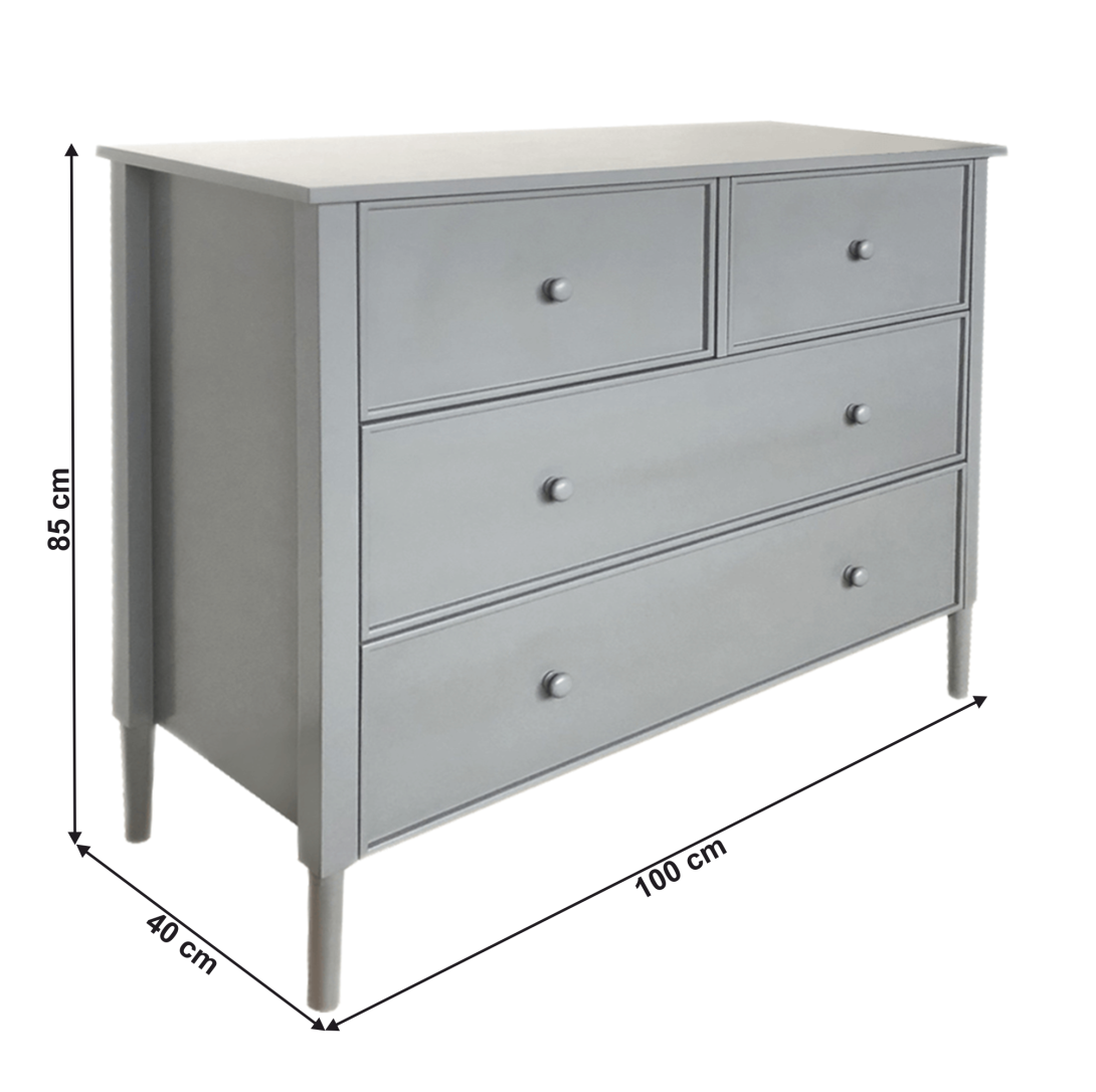 Materiál: MDFFarba: siváRozmery (ŠxHxV): 100x40x85 cmHrúbka materiálu: 1,5 - 3,7 cmDva väčšie šuplíkyDva menšie šuplíkyDrevené úchytkyFarba úchytiek: siváNosnoť: 30 kgNosnosť šuplíka: 10 kgNa nožičkáchVýška nožičiek: 15 cmOdporúčame pripevniť k steneProvensálsky štýlDodávané v demonte