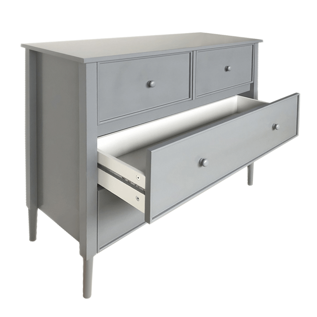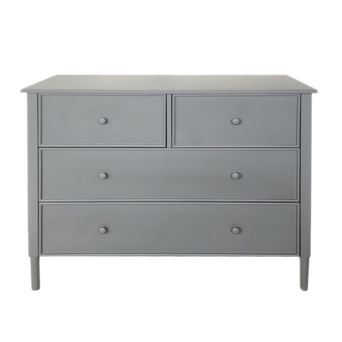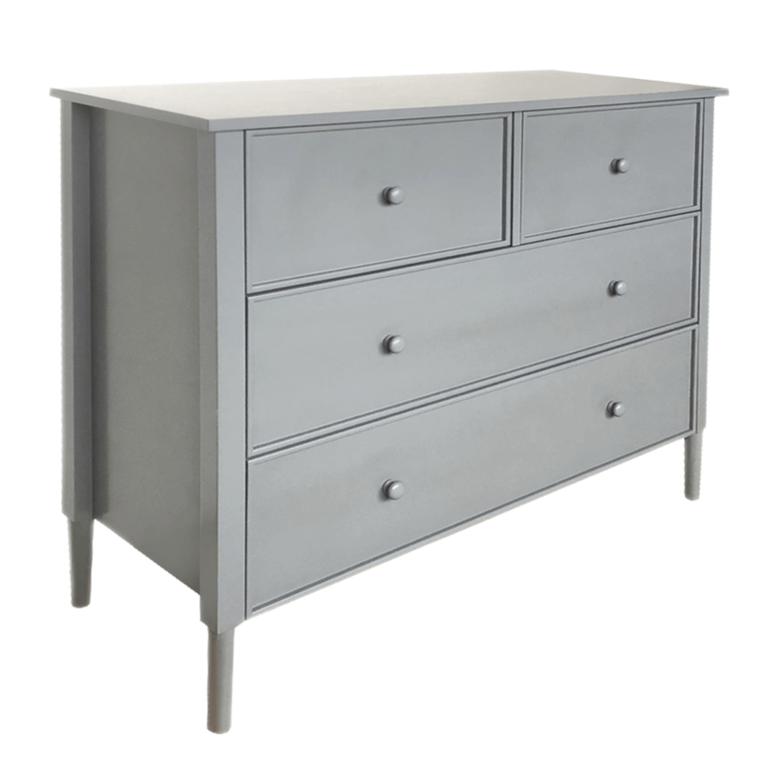 Materiál: MDFFarba: siváRozmery (ŠxHxV): 100x40x85 cmHrúbka materiálu: 1,5 - 3,7 cmDva väčšie šuplíkyDva menšie šuplíkyDrevené úchytkyFarba úchytiek: siváNosnoť: 30 kgNosnosť šuplíka: 10 kgNa nožičkáchVýška nožičiek: 15 cmOdporúčame pripevniť k steneProvensálsky štýlDodávané v demonte