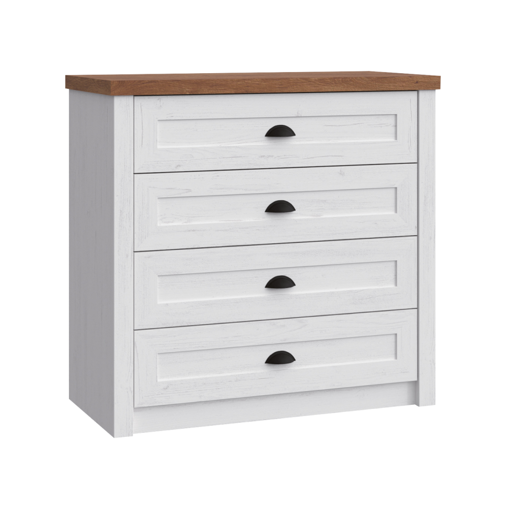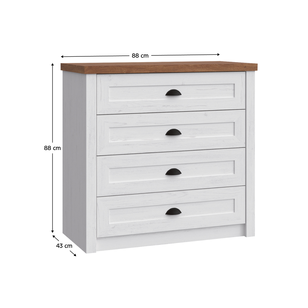 Materiál: DTD laminovanáFarba: sosna andersen/dub lefkasRozmery (ŠxHxV): 88x43x88 cmHrúbka materiálu korpus: 15 mmHrúbka materiálu hornej dosky: 36 mmŠtyri šuplíkyS úchytkamiDodávané v demonte