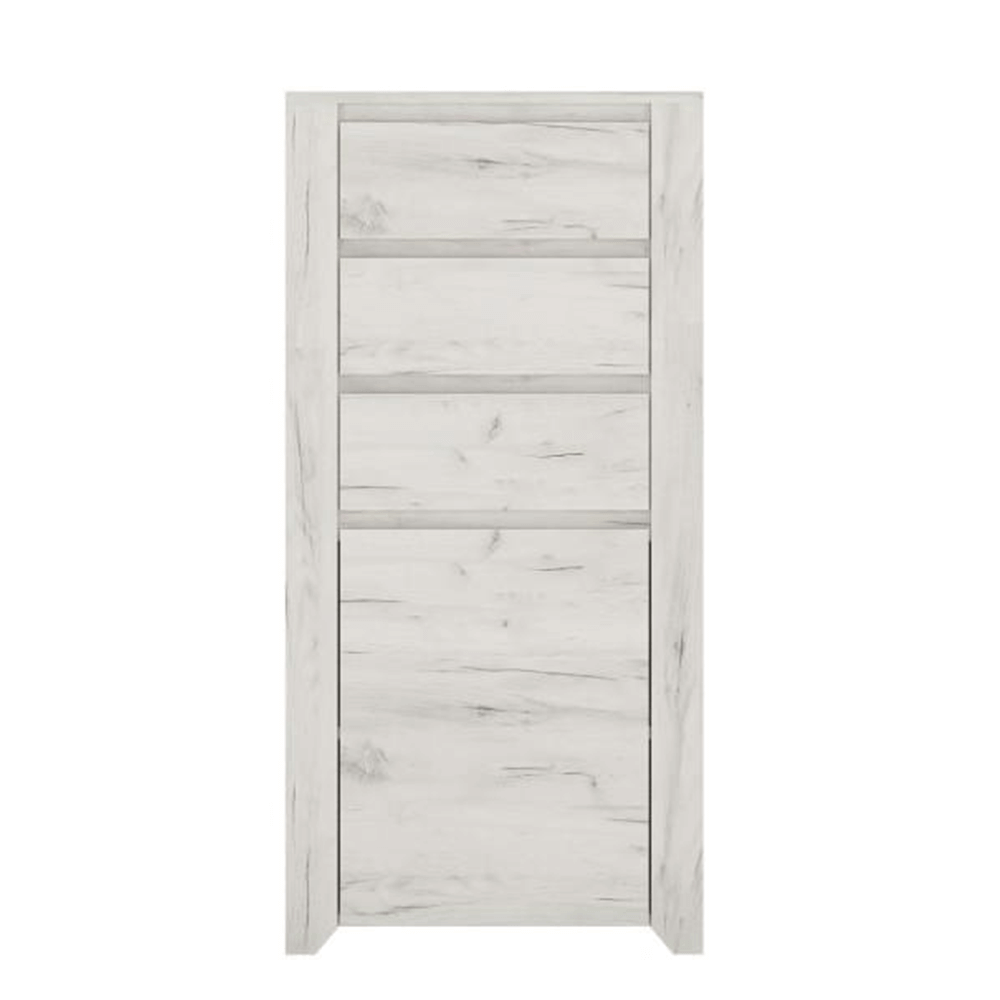 Komoda Typ 35 s troma šuplíkmi a skrinkou zo sektorovej zostavy ANGELMateriál: laminovaná DTD Farba: biela craft Rozmery (ŠxHxV): 56x40,2x116,3 cm Výška spodného priestoru od podlahy: 2,5 cmHrúbka materiálu: 16 mmDodávané v demonte