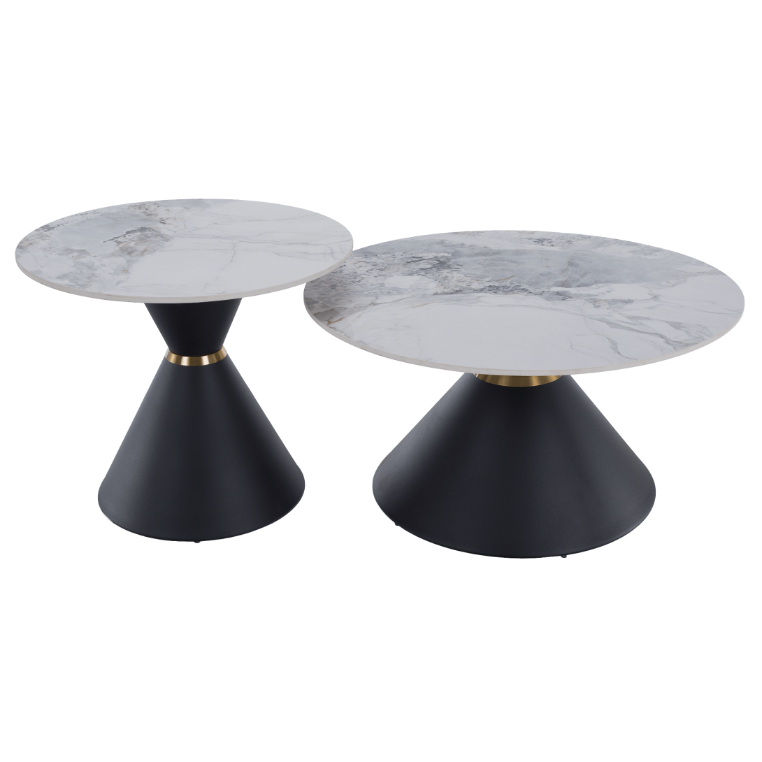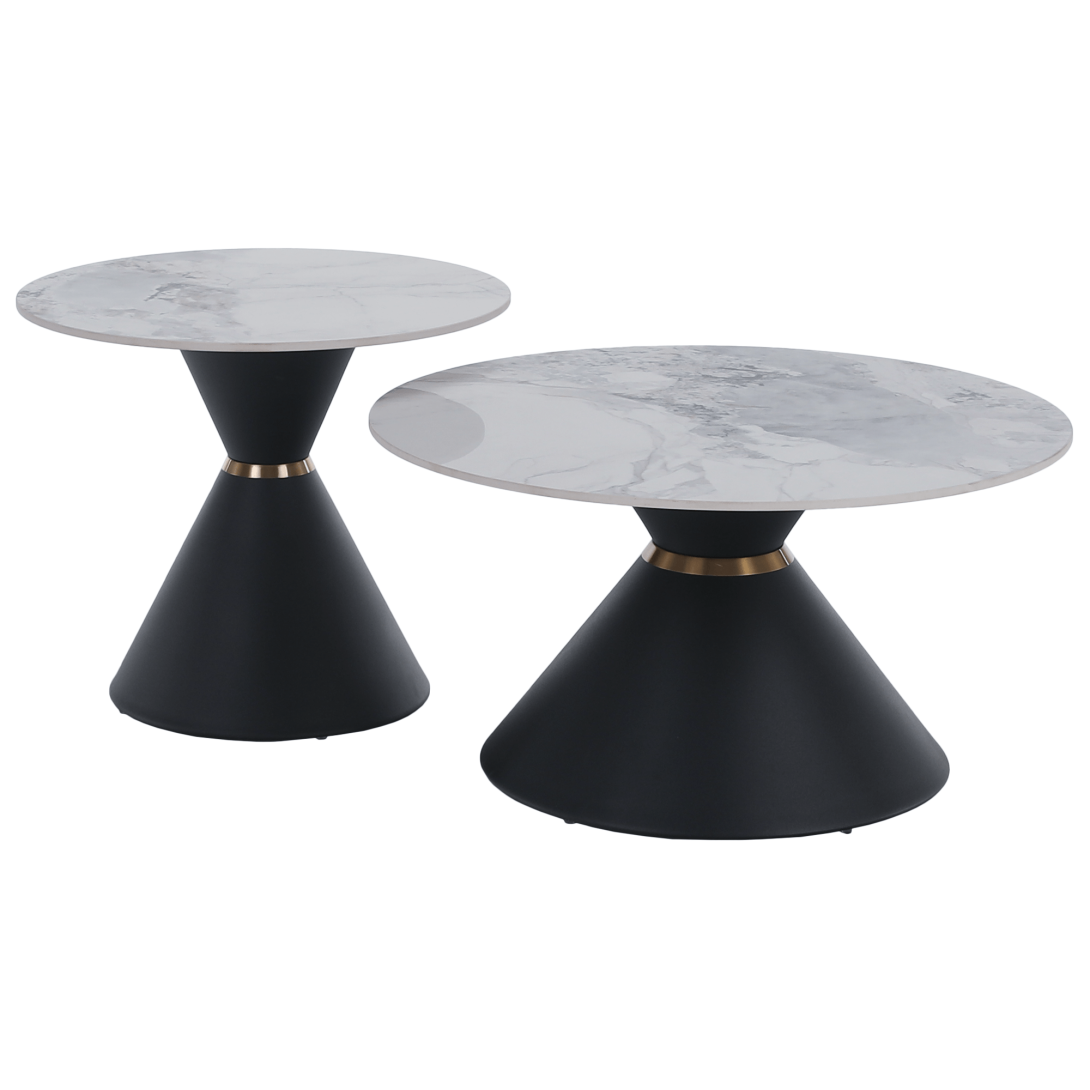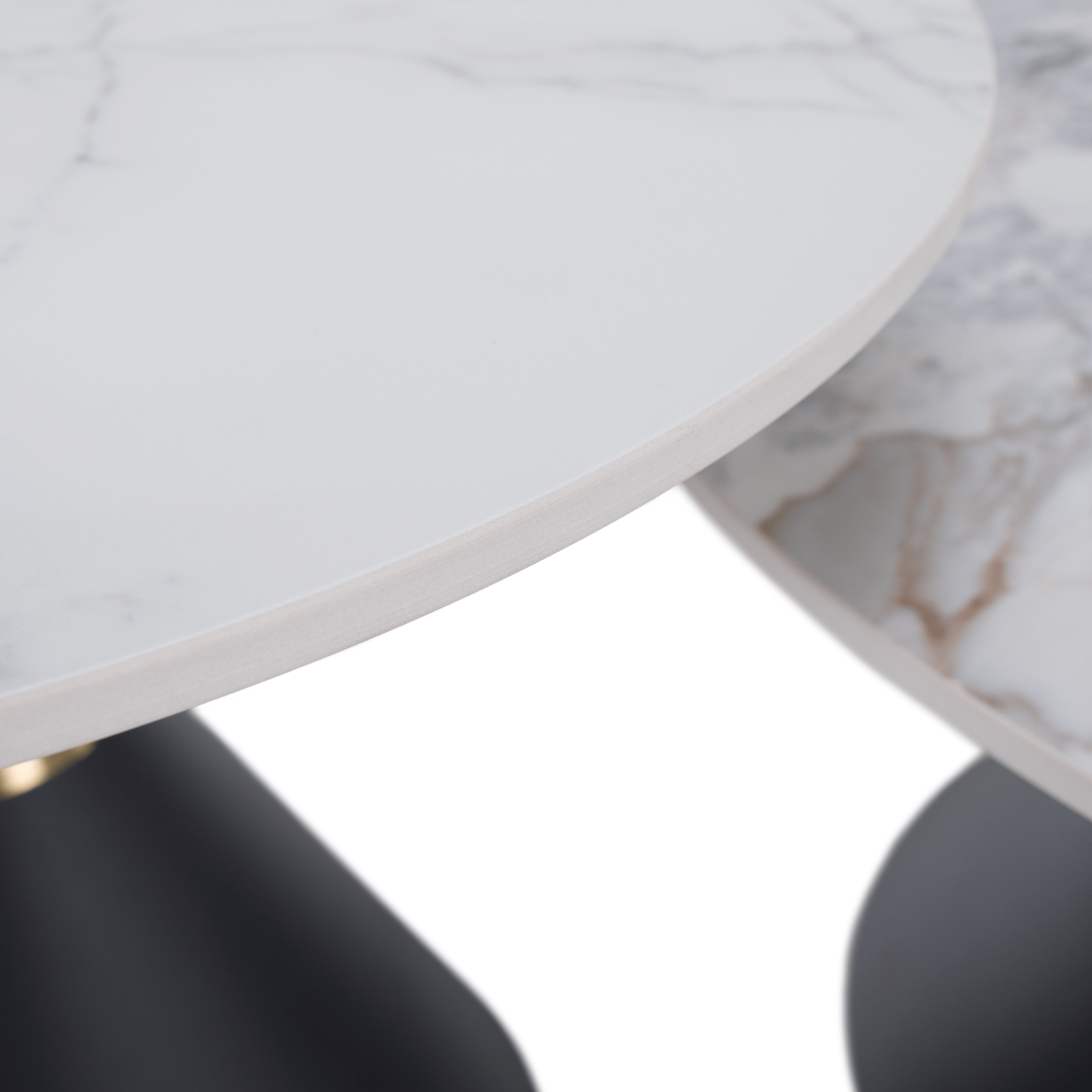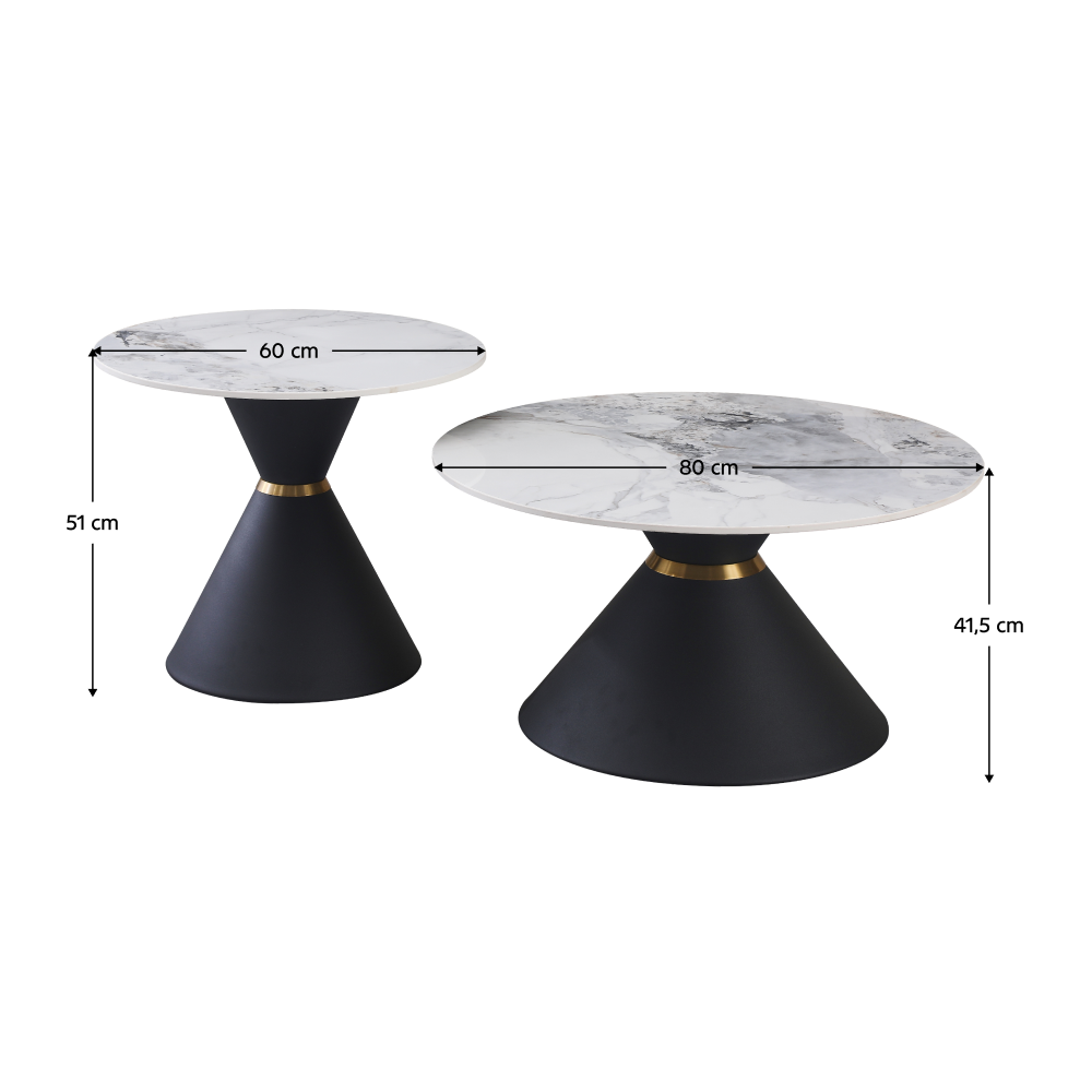 Materiál doska stola: brúsený kameňFarebné prevedenie: biely mramorKonštrukcia nohy: oceľFarebné prevedenie: čiernaSet 2 ksRozmery väčšieho stolíka (PxV): 80x41,5 cmRozmery menšieho stolíka (PxV): 60x51 cmHrúbka platu stola: 1,1 cmZlatý dekoratívny pásikOriginálny kúsokOkrúhlyModerný a štýlovýNosnosť: 30 kgDodávané v demonte
