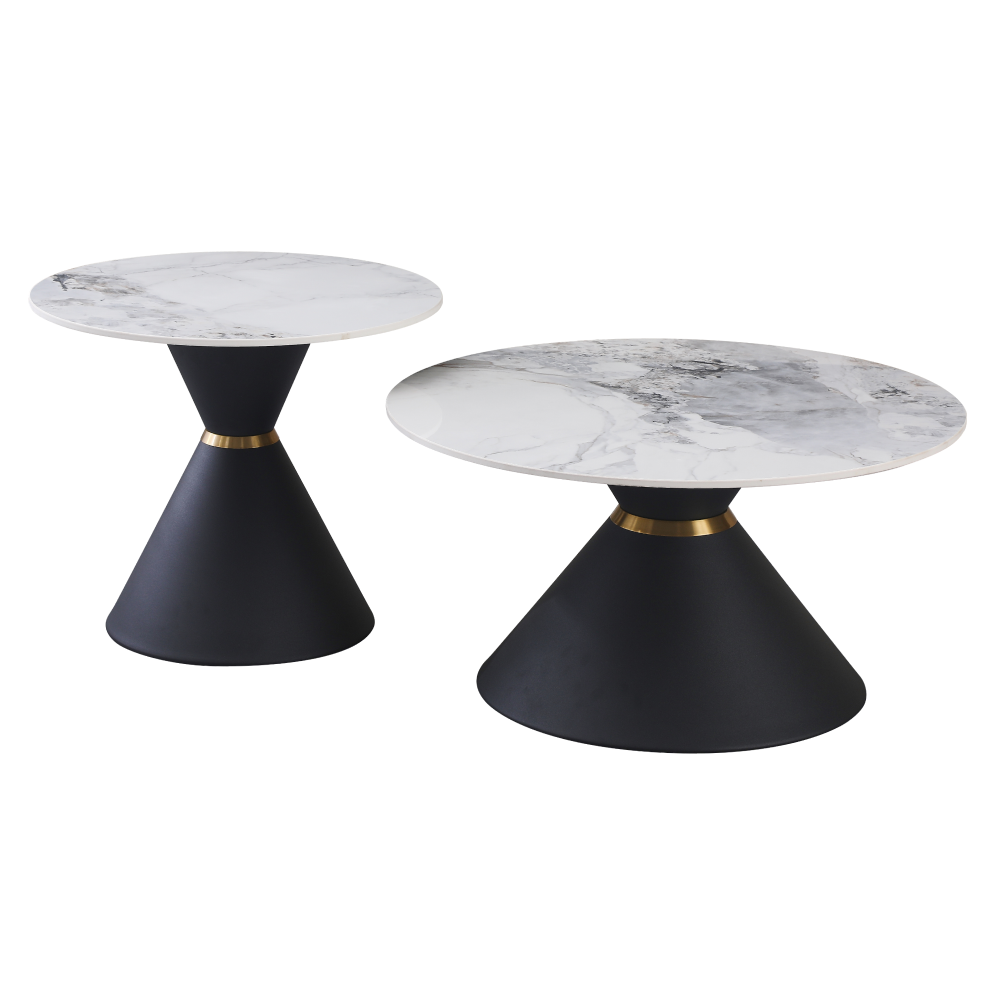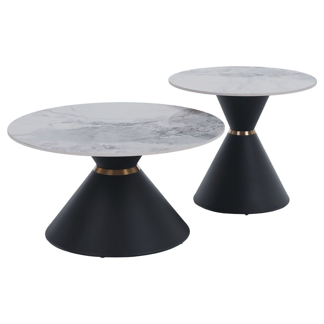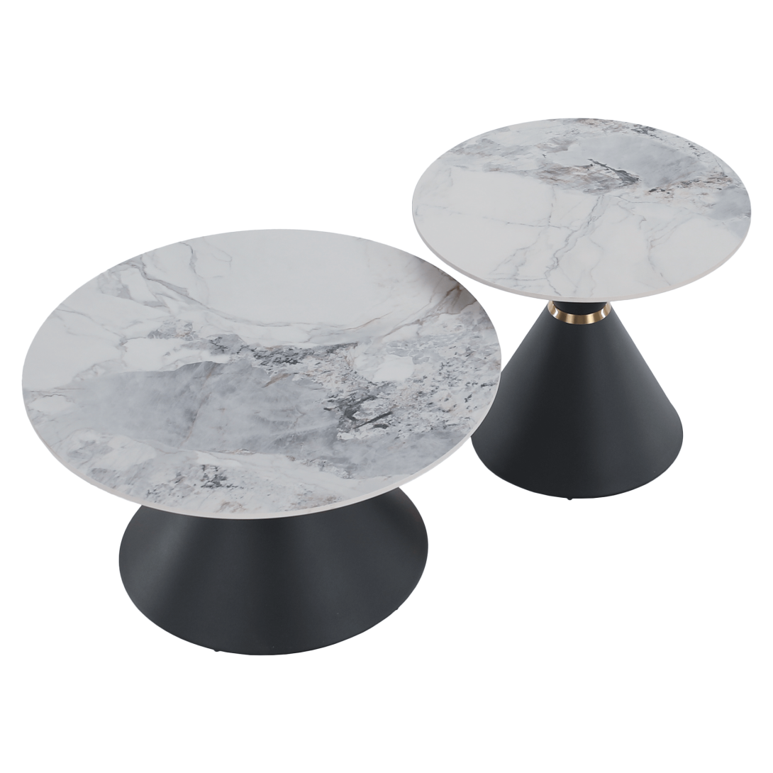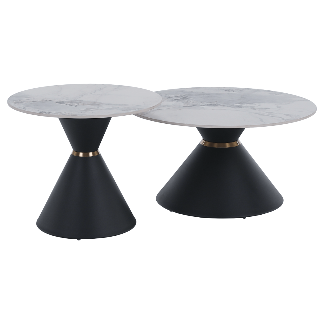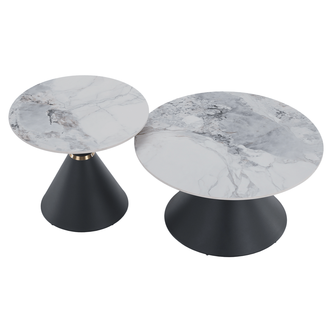 Materiál doska stola: brúsený kameňFarebné prevedenie: biely mramorKonštrukcia nohy: oceľFarebné prevedenie: čiernaSet 2 ksRozmery väčšieho stolíka (PxV): 80x41,5 cmRozmery menšieho stolíka (PxV): 60x51 cmHrúbka platu stola: 1,1 cmZlatý dekoratívny pásikOriginálny kúsokOkrúhlyModerný a štýlovýNosnosť: 30 kgDodávané v demonte