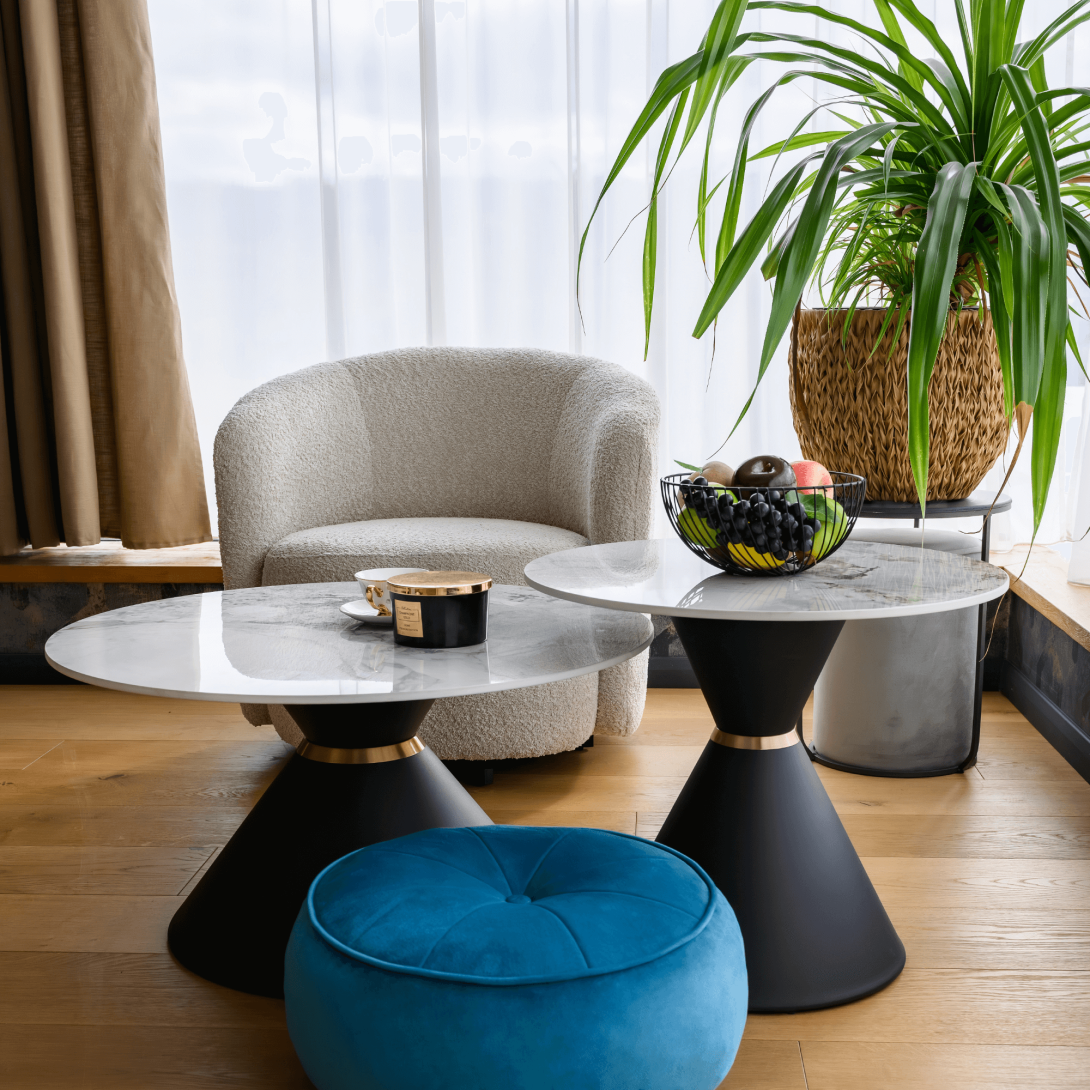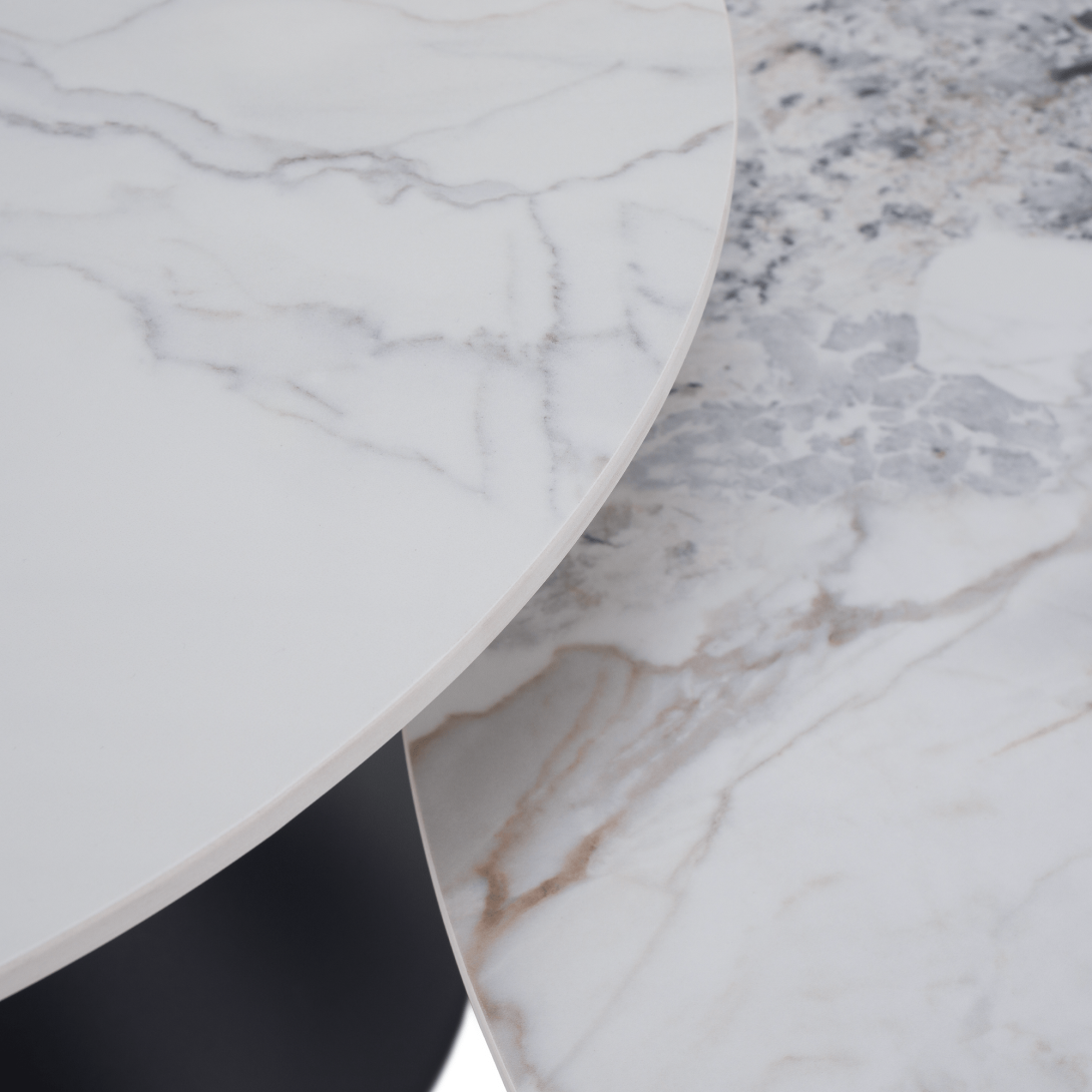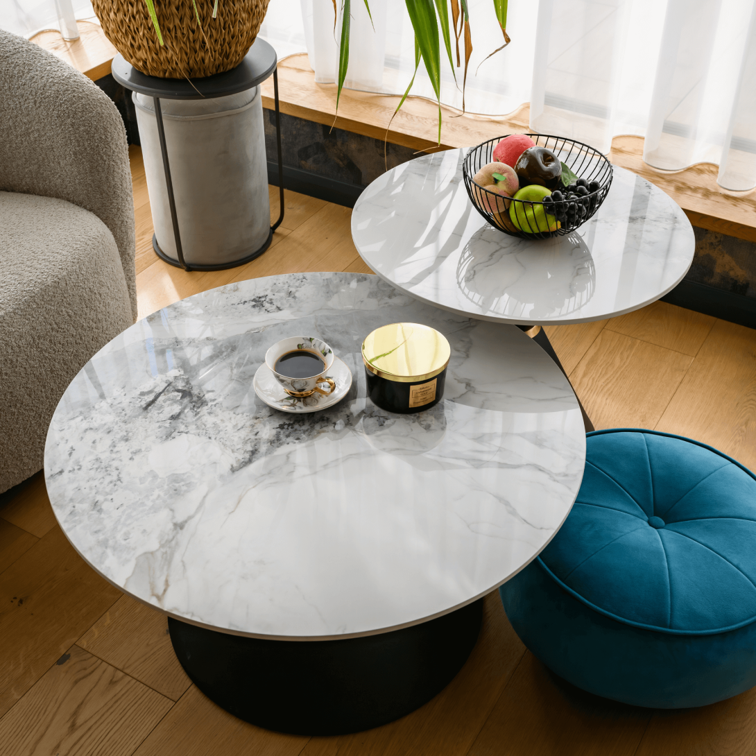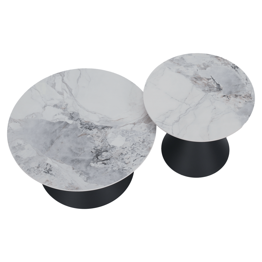 Materiál doska stola: brúsený kameňFarebné prevedenie: biely mramorKonštrukcia nohy: oceľFarebné prevedenie: čiernaSet 2 ksRozmery väčšieho stolíka (PxV): 80x41,5 cmRozmery menšieho stolíka (PxV): 60x51 cmHrúbka platu stola: 1,1 cmZlatý dekoratívny pásikOriginálny kúsokOkrúhlyModerný a štýlovýNosnosť: 30 kgDodávané v demonte