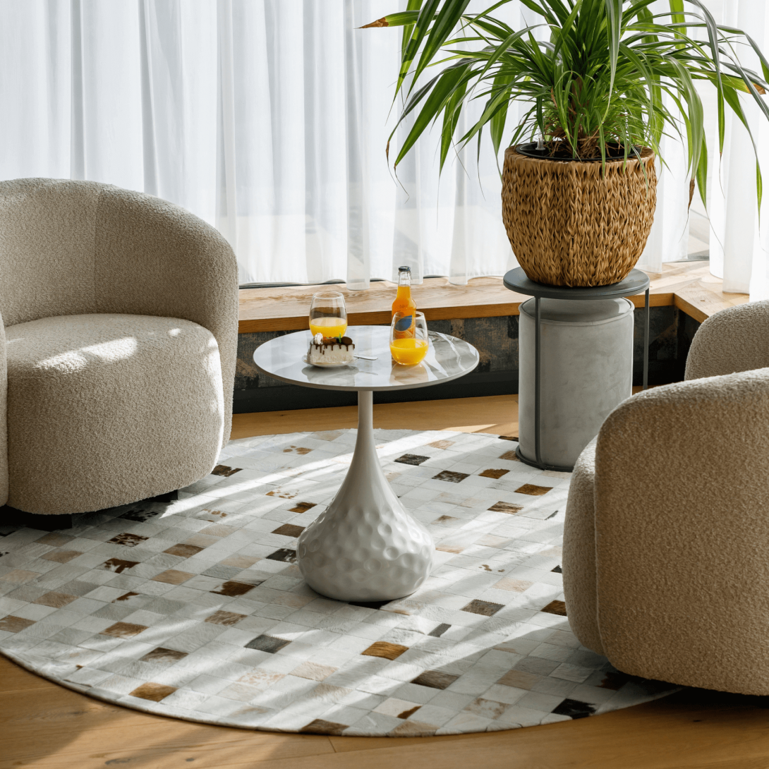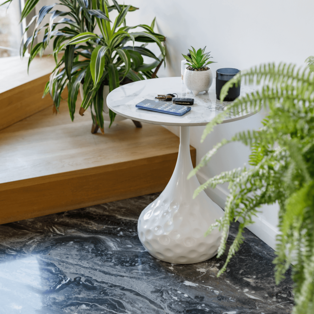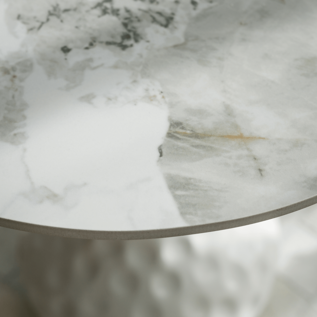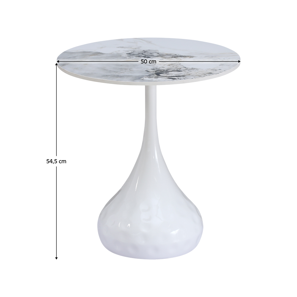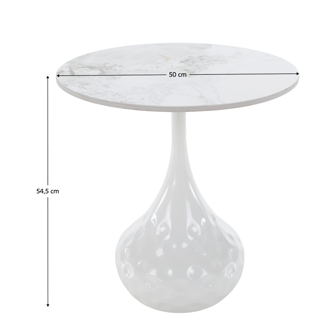 Materiál: brúsený kameň/oceľFarebné prevedenie: biely mramor/bielaRozmery stolíka (PxV): 50x54,5 cmOriginálny kúsokOkrúhlyModerný a štýlovýHrúbka platu stola: 1,1 cmNosnosť: 15 kgDodávané v demonte