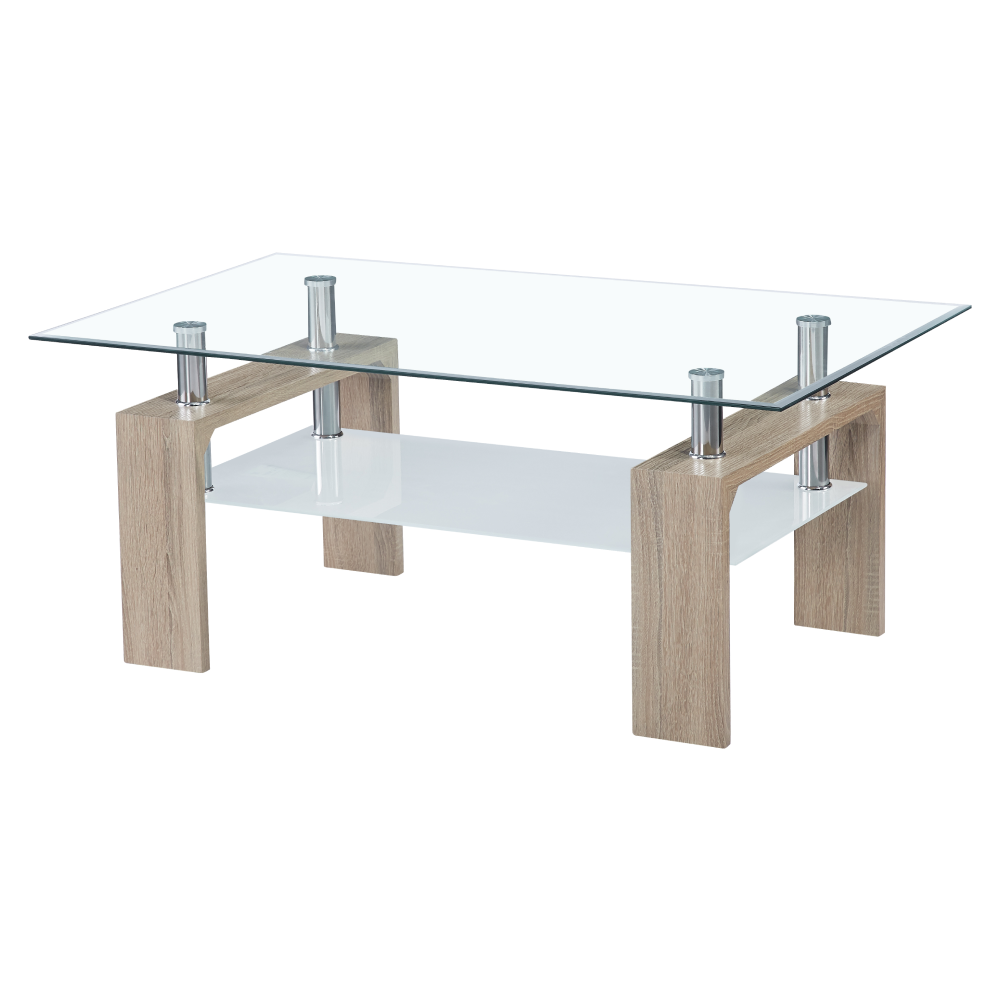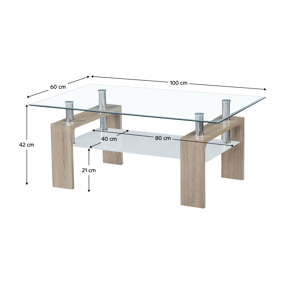 Konferenčný stolík LIBOR 2 NEW Materiál: MDF fóliovaná/tvrdené skloPrevedenie: dub sonoma/číre sklo/mliečne skloRozmery (ŠxHxV): 100x60x42 cmRozmery police (ŠxH): 80x40 cmHrúbka materiálu MDF: 2 cmHrúbka vrchného skla: 6 mmHrúbka spodného skla: 5 mmDodávaný v demonte
