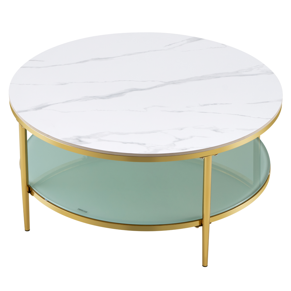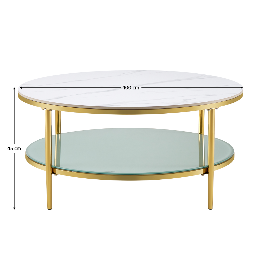 Materiál: oceľ/kamenný plát/tvrdené skloFarba: gold chróm-zlatý/svetlý mramorFarba spodného plátu dosky: mliečnaRozmery stolíka (priemer x V): 100x45 cmHrúbka plátu stola: 1,2 cmHrúbka tvrdeného skla: 0,8 cmLuxusnýOriginálny kúsokOkrúhlyModerný a štýlovýPlát stola je neodnímateľnýNosnosť: 30 kg/každý (rovnomerná záťaž)Dodávané v demonte