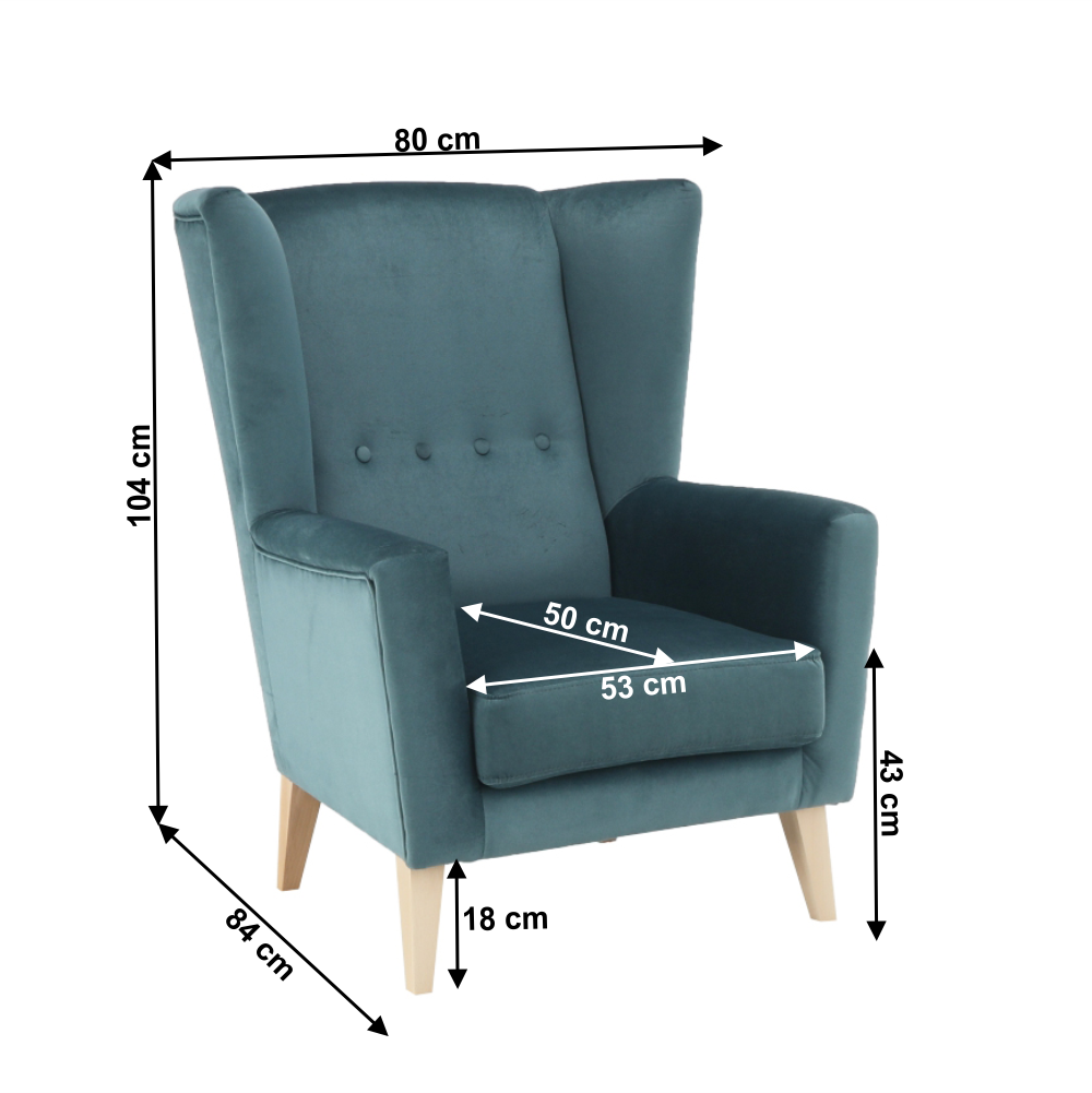 Materiál: látka Kronos 25/drevoOderuodolnosť textílie podľa testu Martindale: 60 000 oderovFarba: mentolová/bukRozmery kresla (ŠxHxV): 80x84x104 cmVýška sedu: 43 cmHĺbka sedu: 50 cmŠírka sedu: 53 cmVýška spodného priestoru od podlahy: 18 cmNosnosť: 120 kgVysoké operadloOzdobné gombíkyDodávané v demonte