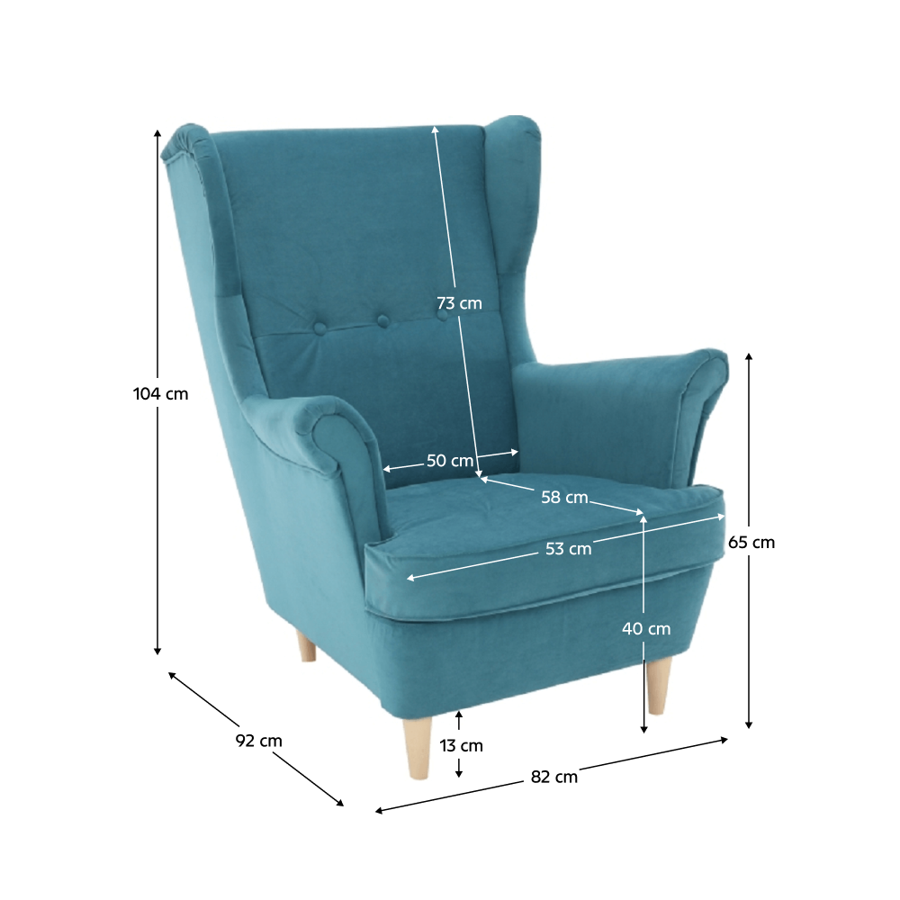 Materiál čalúnenie: látka Trinity 13Oderuodolnosť textílie podľa testu Martindale: 55 000 oderovFarba čalúnenie: petrolejová Materiál nohy: drevoFarba nohy: bukRozmery kresla (ŠxHxV): 82x92x104 cmVýška sedu: 40 cmHĺbka sedu: 58 cmVýška spodného priestoru od podlahy: 13 cmŠírka sedacej časti: 53 cmVýška chrbtovej opierky: 73 cmVýška od zeme po opierku: 65 cmNosnosť: 120 kgDrevené nožičkyDodávané v demonte
