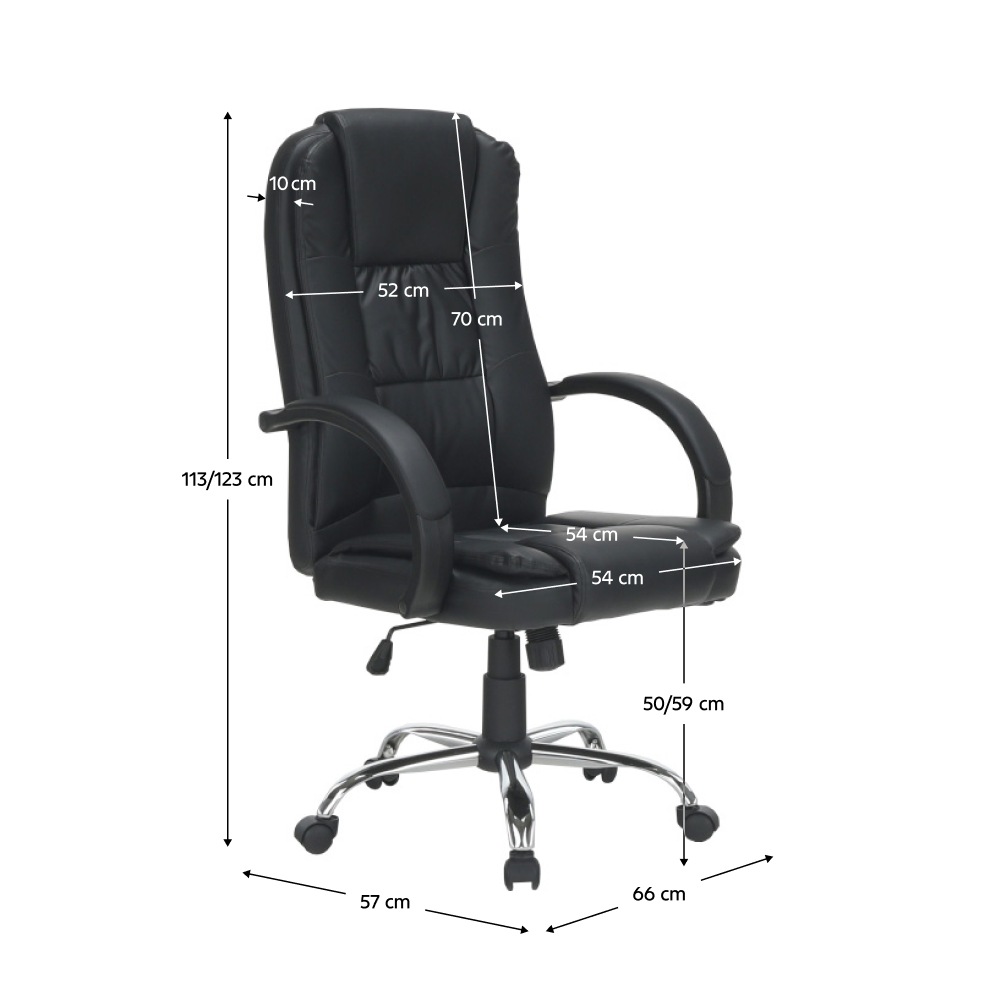 Materiál: ekokoža/kov/plastOderuodolnosť ekokože podľa testu Martindale: 100 000 oderovFarba: čierna/chrómRozmery (ŠxHxV): 66x57x113-123 cmVýška sedu: 50-59 cmHĺbka sedu: 54 cmNosnosť: 150 kgOpierka chrbta (ŠxV): 52x70 cmSedadlo (ŠxH): 54x54 cmMožnosť nastaviť výšku seduFunkcia hojdaniaKovová ružicaPlastové opierky na rukyOpierky na ruky čalúnenéDodávané v demonte