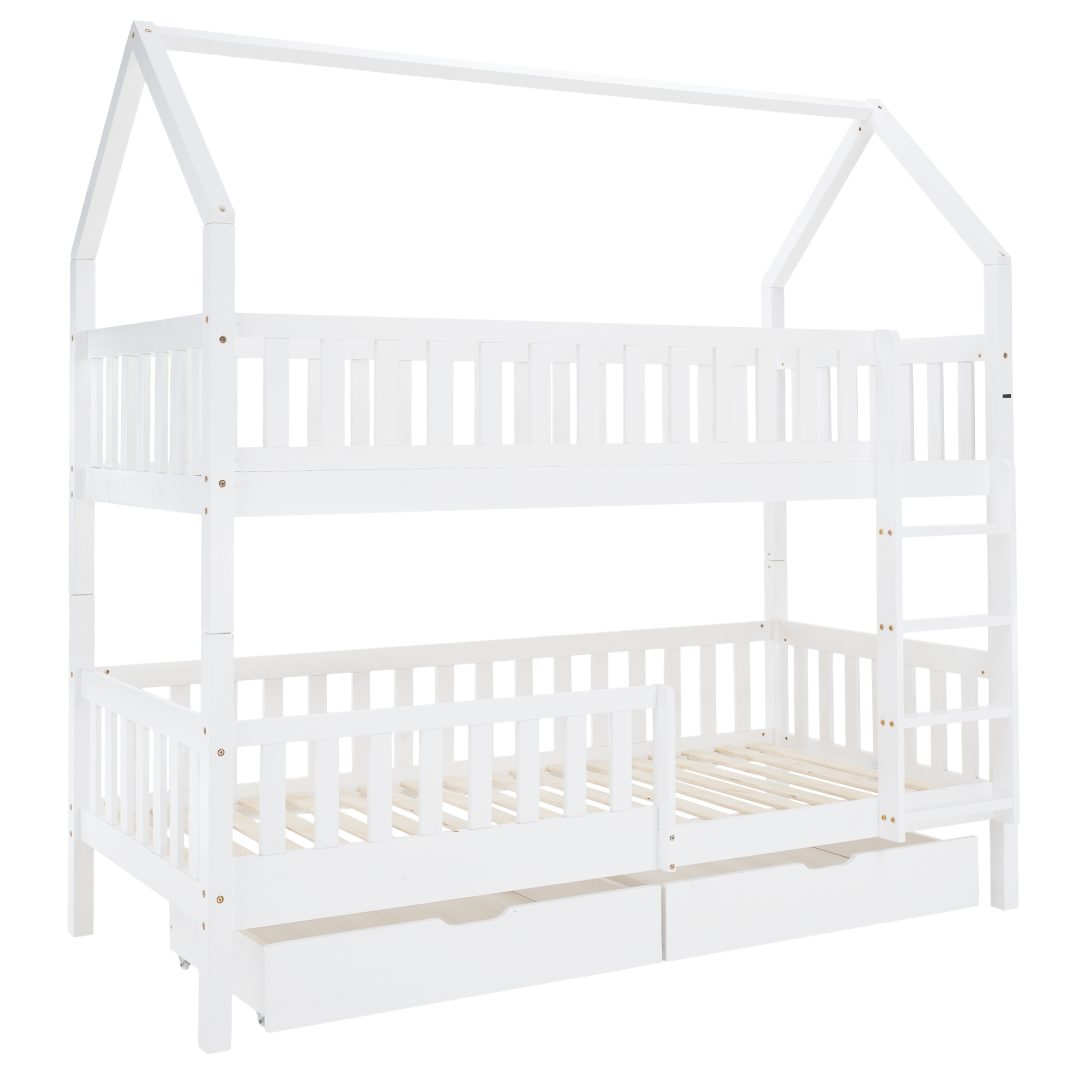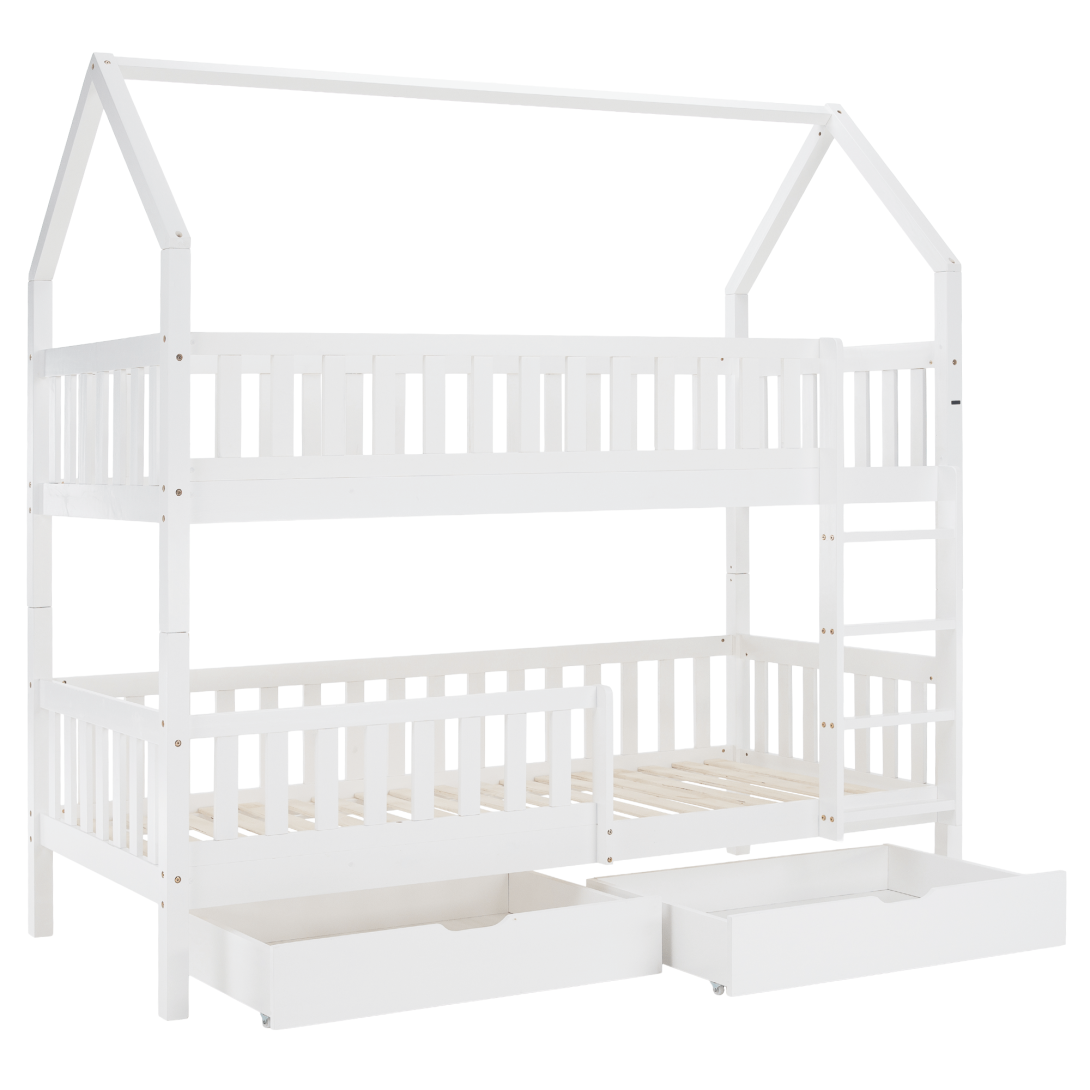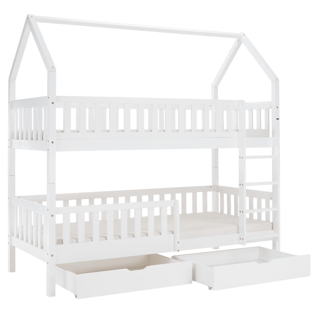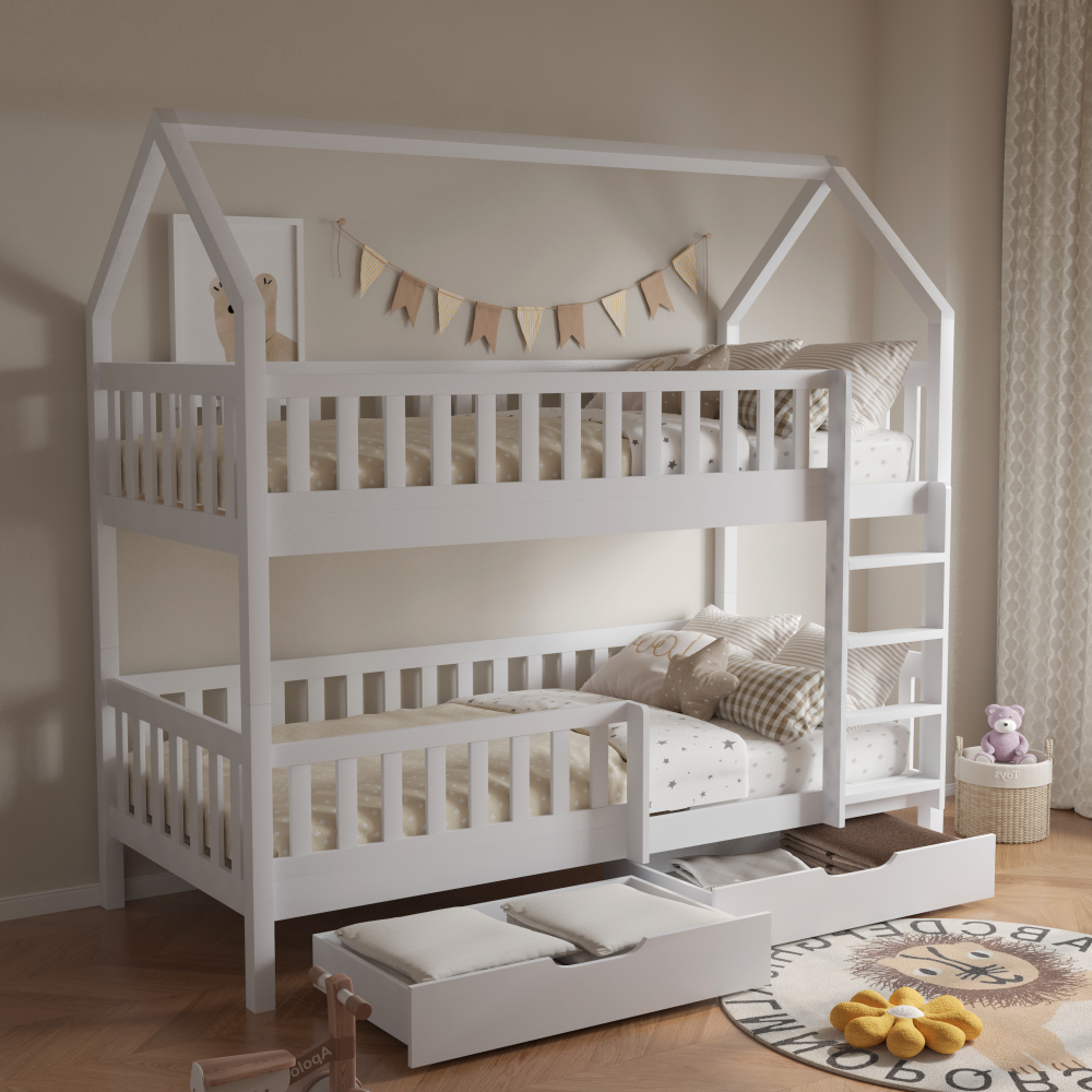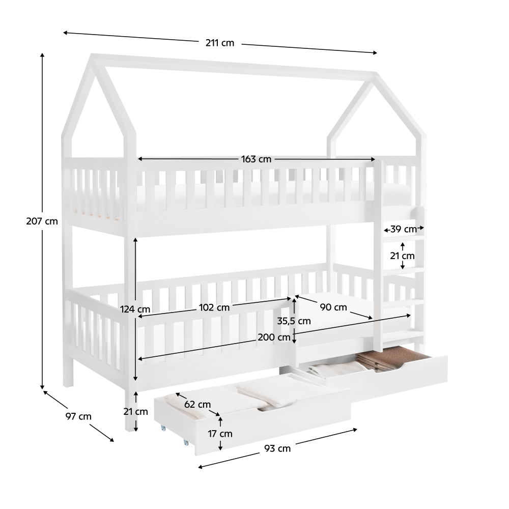 Materiál: borovicové drevo/preglejkaFarba: bielaRozmery (ŠxHxV): 211x97x207 cmPlocha na spanie (ŠxD): 90x200 cmHrúbka materiálu: 2 cmVýška medzi spodným a horným lôžkom: 124 cmPosteľ v tvare domčekaNosnosť na horné lôžko: 90 kgNosnosť na spodné lôžko: 95 kgNa nožičkáchVýška nožičiek: 21 cmDva šuplíkyRozmer šuplíka (ŠxV): 93x17 cmS rebríkomS bezpečnostnou bariérouMožnosť namontovať zábranu a rebrík na ľavú alebo pravú stranuDodávaná bez matracaMožnosť zakúpiť pružinový matrac z našej ponukyOdporúčaná výška matraca na horné lôžko: max. 14 cmOdporúčaná výška matraca na spodné lôžko: max. 18 cmDodávaná s preglejkovými rolovanými roštamiRozložiteľná na dve lôžkaDodávané v demonte