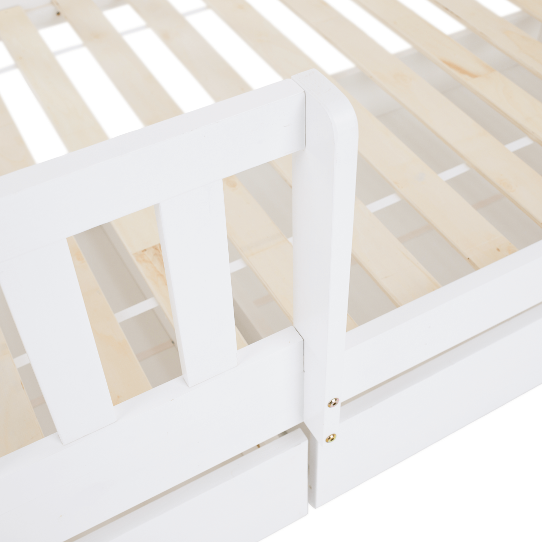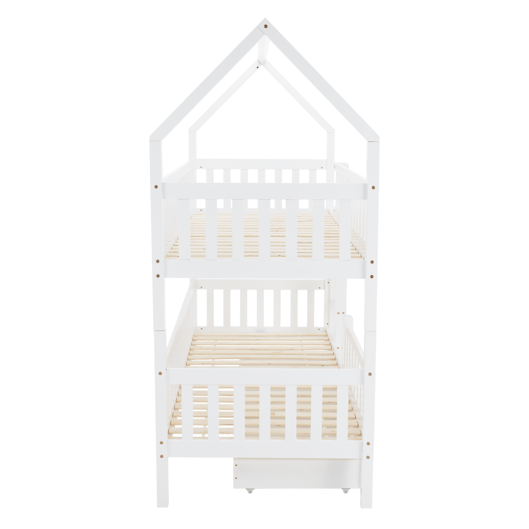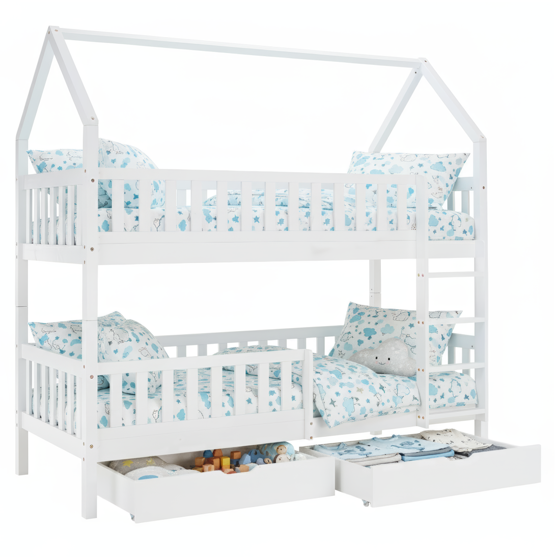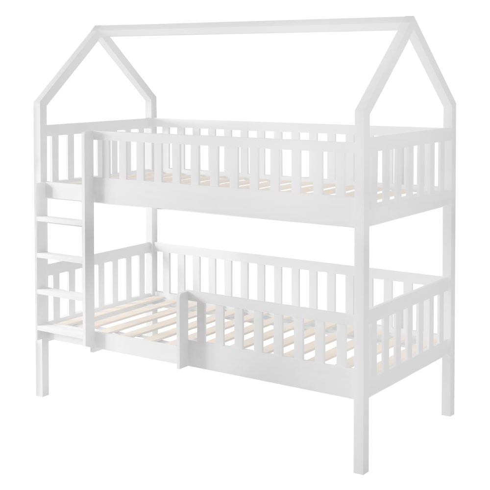 Materiál: borovicové drevo/preglejkaFarba: bielaRozmery (ŠxHxV): 211x97x207 cmPlocha na spanie (ŠxD): 90x200 cmHrúbka materiálu: 2 cmVýška medzi spodným a horným lôžkom: 124 cmPosteľ v tvare domčekaNosnosť na horné lôžko: 90 kgNosnosť na spodné lôžko: 95 kgNa nožičkáchVýška nožičiek: 21 cmDva šuplíkyRozmer šuplíka (ŠxV): 93x17 cmS rebríkomS bezpečnostnou bariérouMožnosť namontovať zábranu a rebrík na ľavú alebo pravú stranuDodávaná bez matracaMožnosť zakúpiť pružinový matrac z našej ponukyOdporúčaná výška matraca na horné lôžko: max. 14 cmOdporúčaná výška matraca na spodné lôžko: max. 18 cmDodávaná s preglejkovými rolovanými roštamiRozložiteľná na dve lôžkaDodávané v demonte