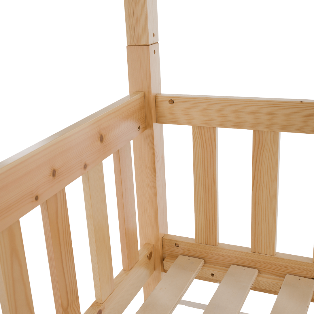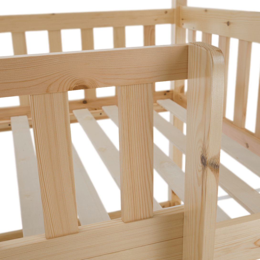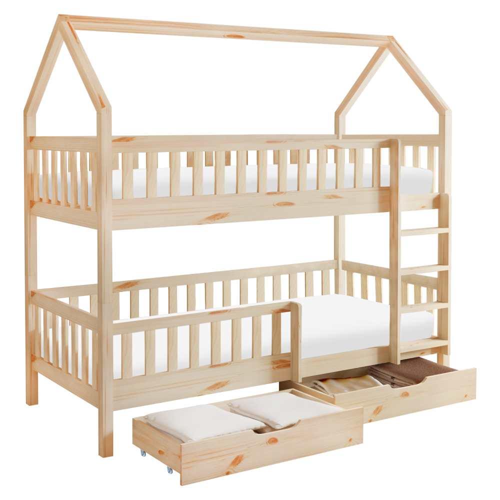 Materiál: borovicové drevo/preglejkaFarba: prírodnáRozmery (ŠxHxV): 211x97x207 cmPlocha na spanie (ŠxD): 90x200 cmHrúbka materiálu: 2 cmVýška medzi spodným a horným lôžkom: 124 cmPosteľ v tvare domčekaNosnosť na horné lôžko: 90 kgNosnosť na spodné lôžko: 95 kgNa nožičkáchVýška nožičiek: 21 cmDva šuplíkyRozmer šuplíka (ŠxV): 93x17 cmS rebríkomS bezpečnostnou bariérouMožnosť namontovať zábranu a rebrík na ľavú alebo pravú stranuDodávaná bez matracaMožnosť zakúpiť pružinový matrac z našej ponukyOdporúčaná výška matraca na horné lôžko: max. 14 cmOdporúčaná výška matraca na spodné lôžko: max. 18 cmDodávaná s preglejkovými rolovanými roštamiRozložiteľná na dve lôžkaDodávané v demonte