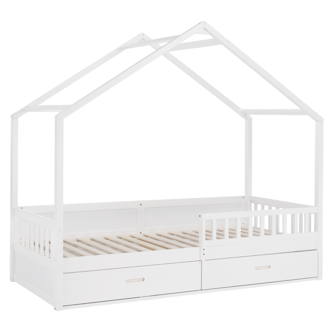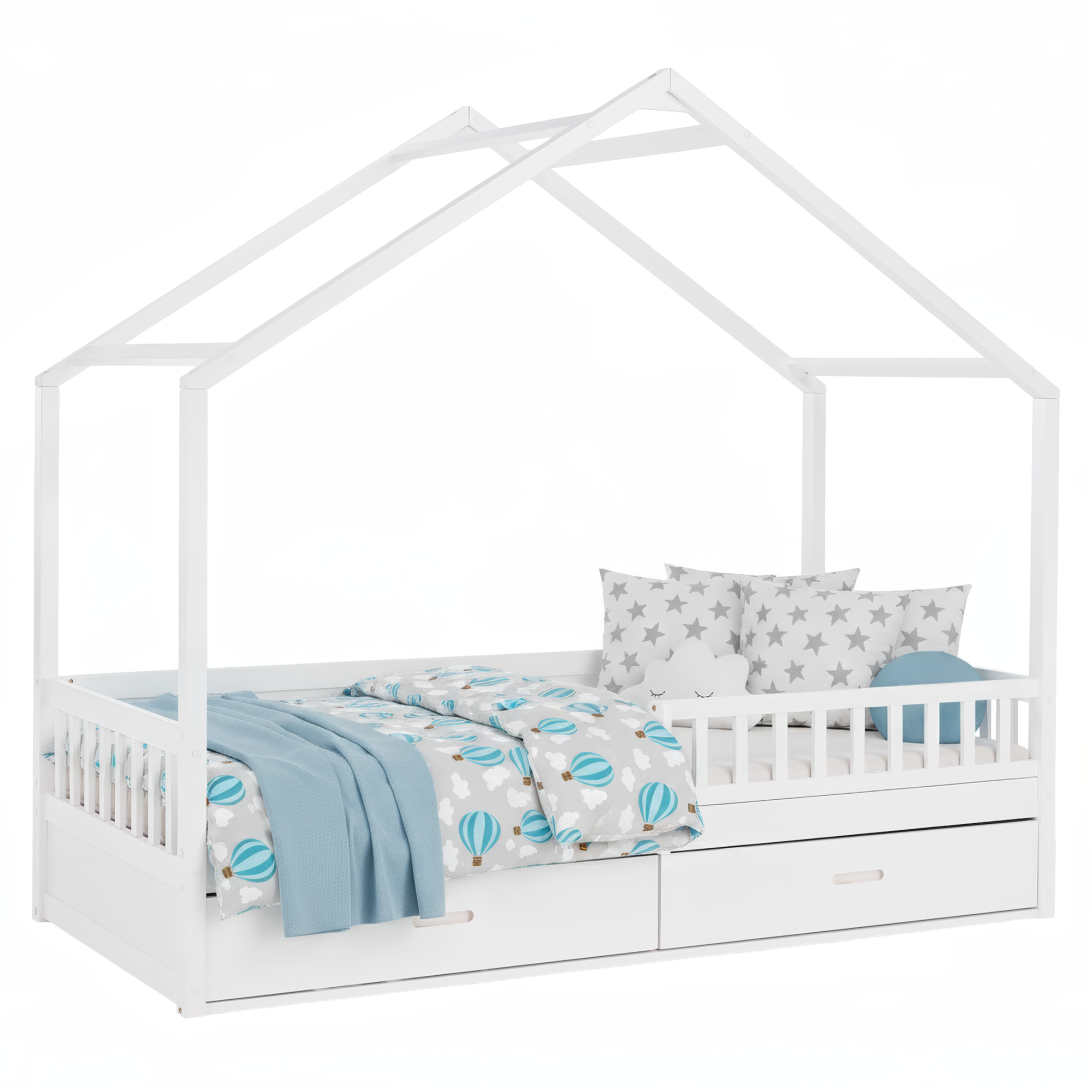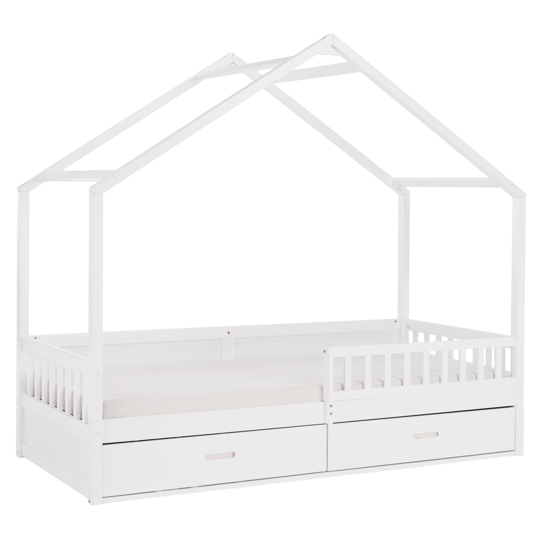 Materiál: masív borovicaFarba: bielaRozmery (ŠxHxV): 207x97x187 cmPlocha na spanie (ŠxD): 90x200 cmHrúbka materiálu: 2 cmVýška po rošt: 27 cmNosnosť: 95 kgÚložný priestorDva šuplíkyRozmer šuplíka (ŠxHxV): 99x62x21,5 cmNosnosť šuplíka: 10 kgMožnosť namontovať zábranu na ľavú alebo pravú stranuVýška zábrany: 32 cmPosteľ v tvare domčekaDodávaná s preglejkovým rolovaným roštomDodávaná bez matracaMožnosť zakúpiť pružinový matrac z našej ponukyOdporúčaná maximálna výška matraca: 12 cmDodávané v demonte