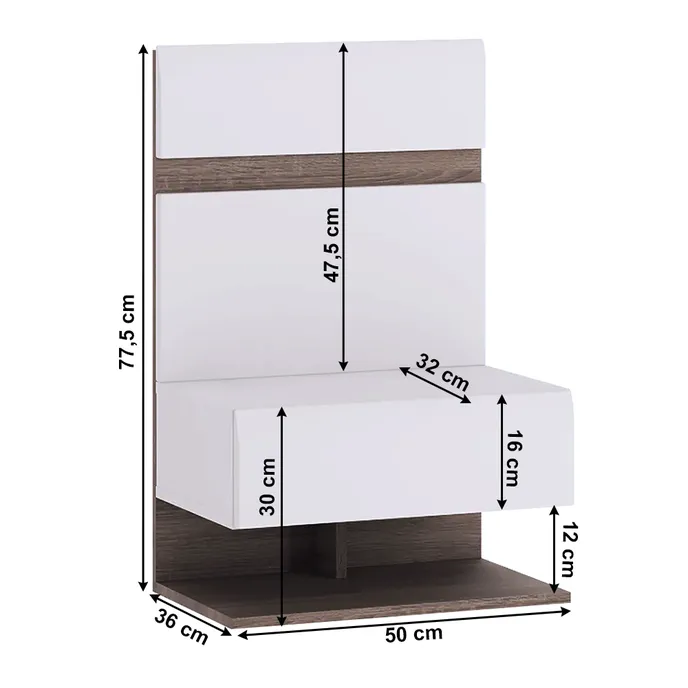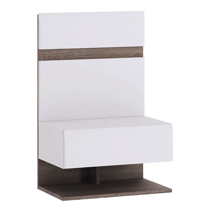 Nočný stolík LYNATET 95Prevedenie: biela extra vysoký lesk HG/dub sonoma truflovýMateriál: DTD laminovaná, dvierka MDF laminovanáDvierka majú moderné zaoblené hrany. Korpus je v matnom prevedeníDvierka sú v prevedení extra vysoký leskRozmery (ŠxHxV): 50x36x77,5 cm.Hrúbka materiálu: 16 mmDodávané v demonte.