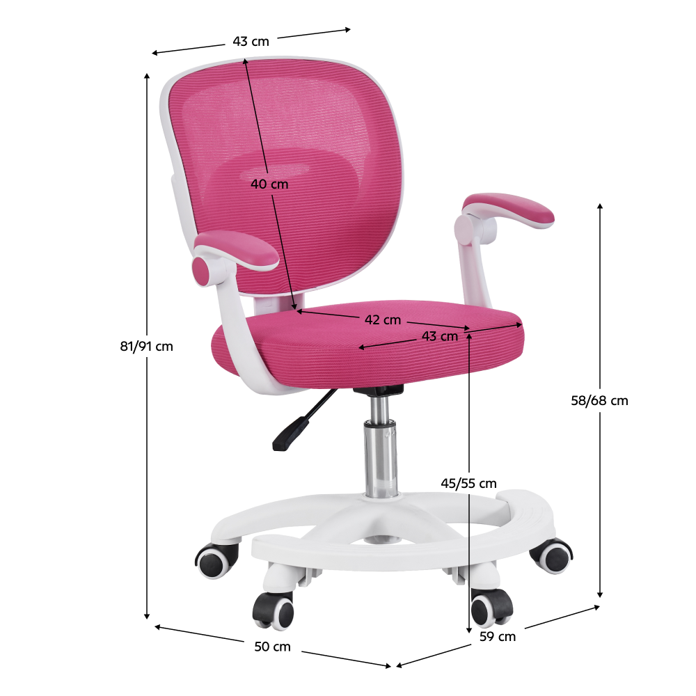 Materiál: sieťovina/plastOderuodolnosť sieťoviny podľa testu Martindale: 90 000 oderovFarba: malinová/bielaRozmery (ŠxHxV): 59x50x81-91 cmVýška sedu: 45-55 cmHĺbka sedu: 42 cmŠírka sedu: 43 cmVýška chrbtovej opierky: 40 cmŠírka chrbtovej opierky: 43 cmNosnosť: 90 kgOtočná stoličkaNastaviteľná výška seduOpierky na ruky s funkciou sklopeniaUniverzálne kolieskaKolieska sú vhodné na mäkké aj tvrdé podlahyPodnož na nohyDodávané v demonte