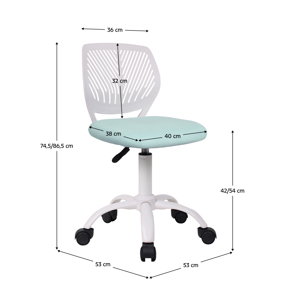 Materiál: polyester/kovOderuodolnosť textílie podľa testu Martindale: 100 000 oderovFarba: neomint/bielaRozmery (ŠxHxV): 53x53x74,5-86,5 cmNastaviteľná výška sedu : 42-54 cmHĺbka sedu : 38 cmŠírka sedu : 40 cmVýška chrbtovej opierky: 32 cmŠírka chrbtovej opierky: 36 cmNosnosť: 80 kgOtočnáS kolieskamiPerforované operadloDodávané v demonte