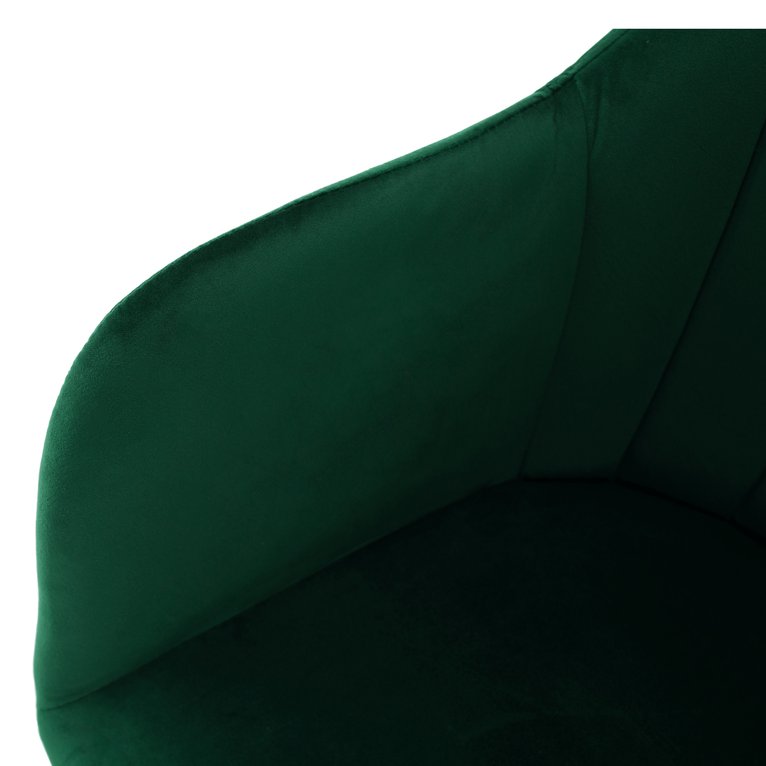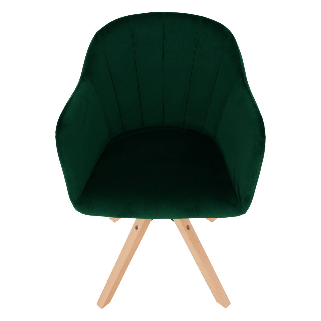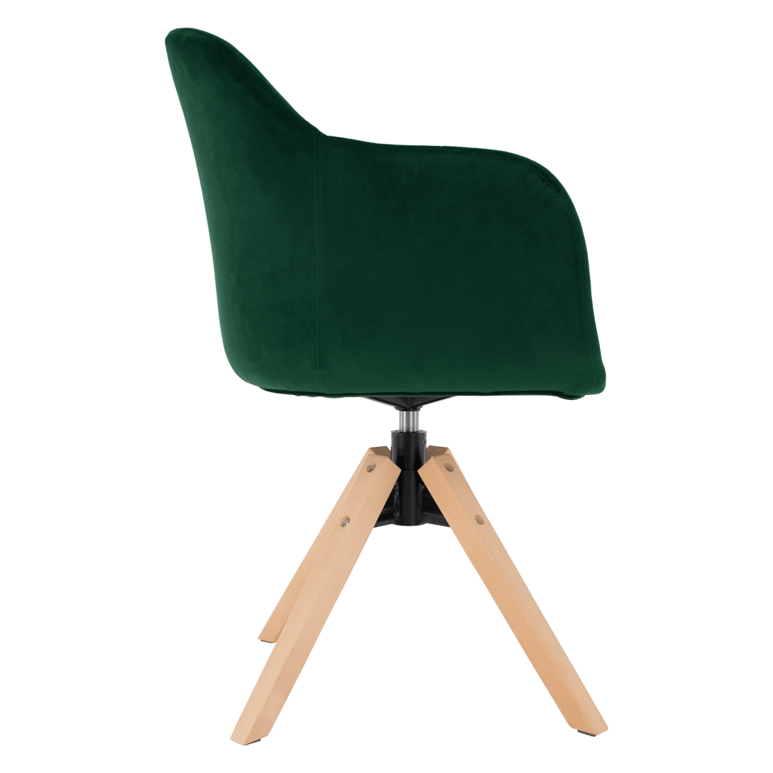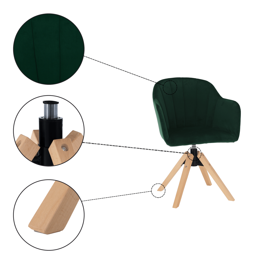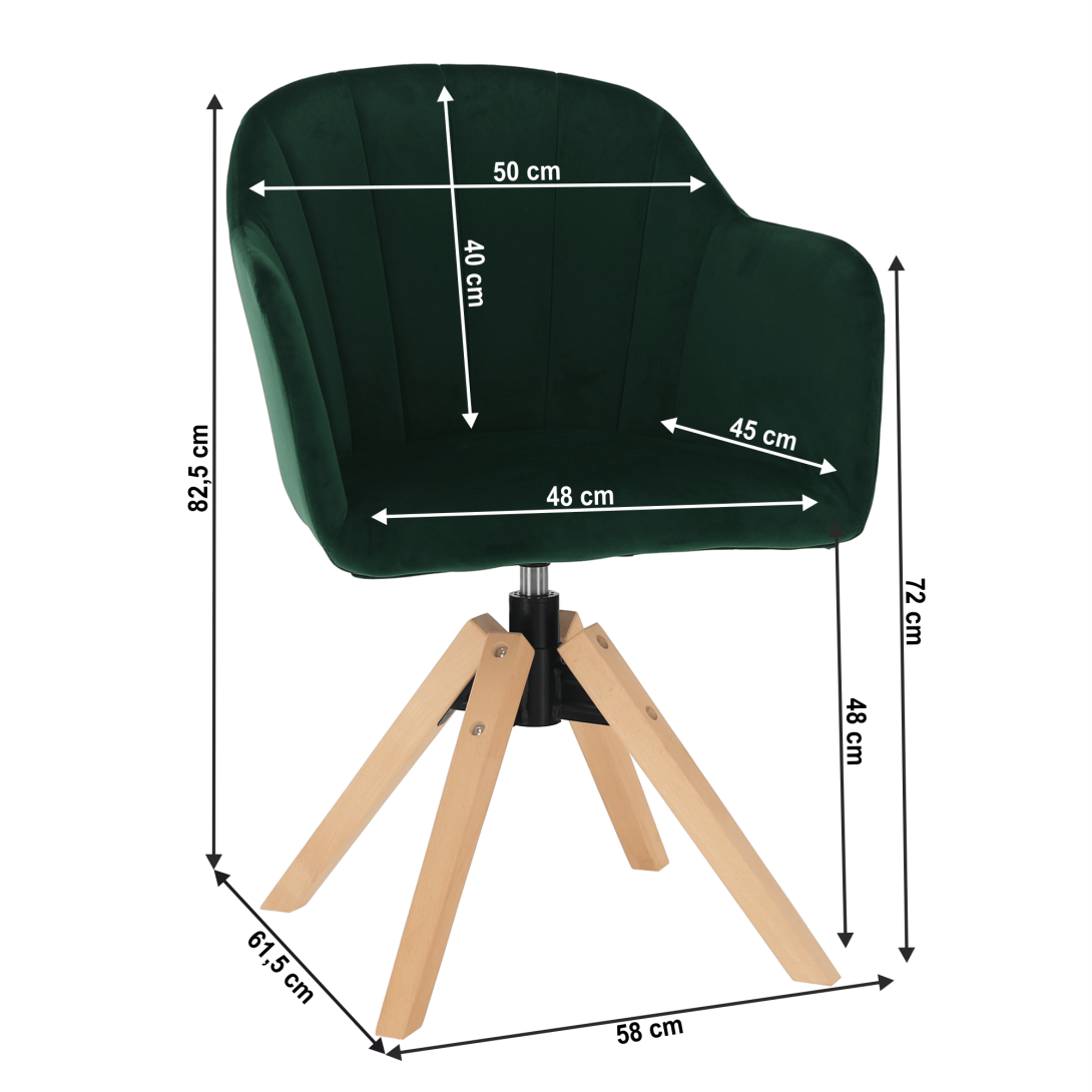 Materiál: látka Velvet/masívne drevoOderuodolnosť textílie podľa testu Martindale: 85 000 oderovFarba: smaragd/bukRozmery (ŠxHxV): 58x61,5x82,5 cmVýška sedu : 48 cmHĺbka sedu: 45 cmŠírka sedu: 48 cmVýška chrbtovej opierky: 40 cmŠírka chrbtovej opierky: 50 cmVýška od zeme po opierku na ruku: 72 cmMaximálna nosnosť: 110 kgOtočné sedadloDodávané v demonte.