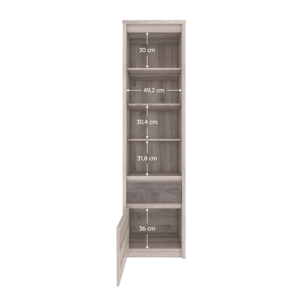 Materiál: DTD laminovanáFarba: gaštan nairobi/onyxRozmery (ŠxHxV): 56x40x210 cmHrúbka materiálu: 1,6-3,2 cmKovové úchytkyFarba úchytiek: čiernaJednodverováJeden šuplíkNosnosť šuplíka: 3 kgOtvorené policeNosnosť police: 5 kgPlastové nožičkyOdporúčame pripevniť k steneModerný dizajnDodávané v demonte