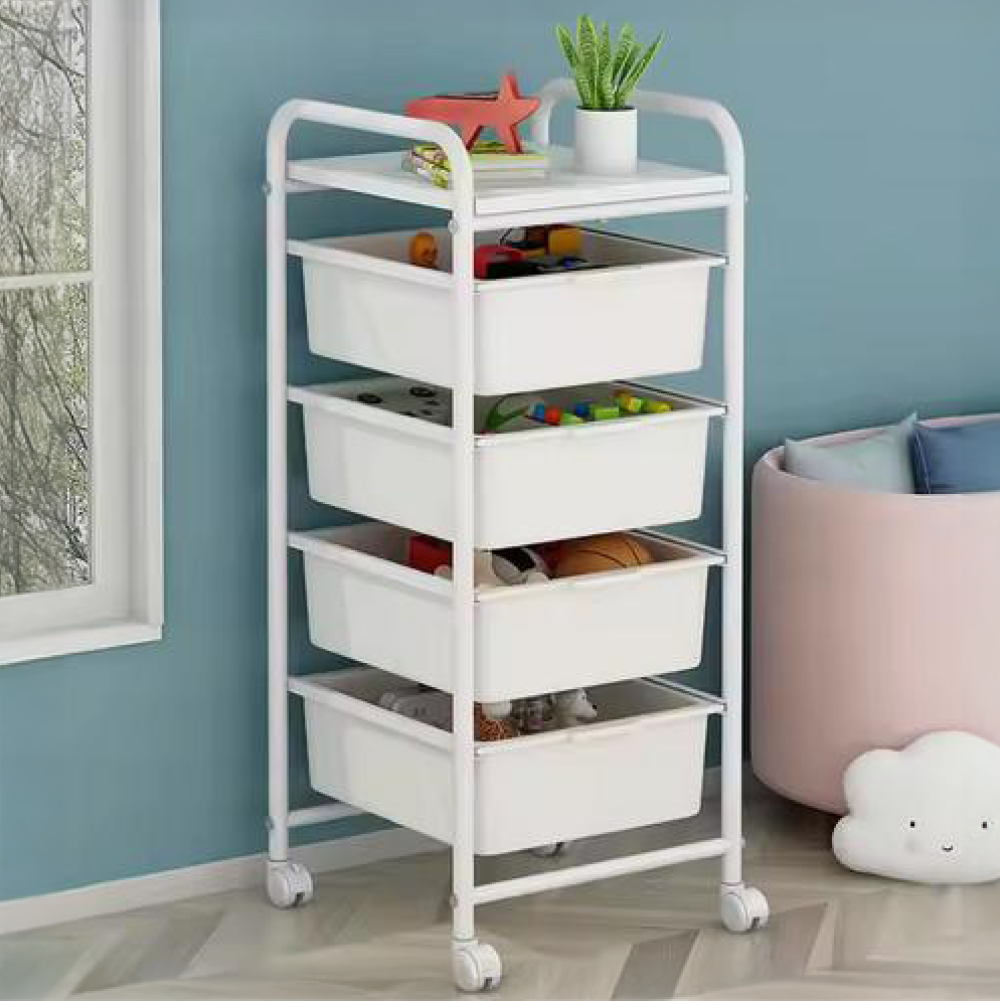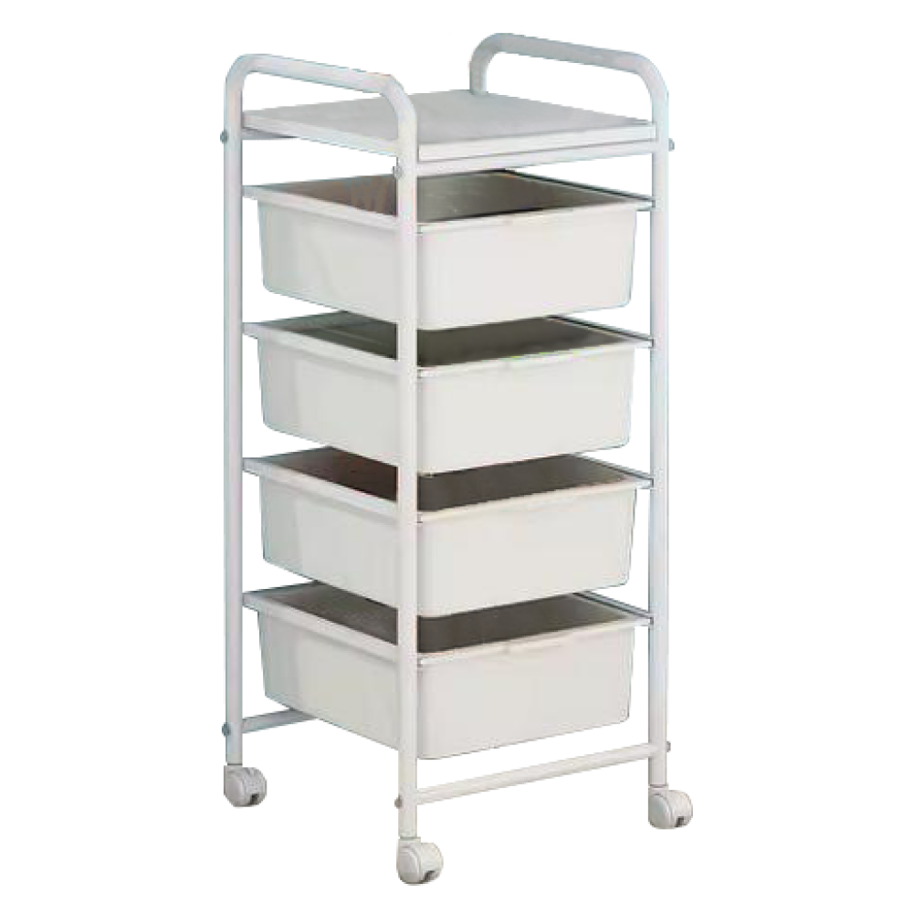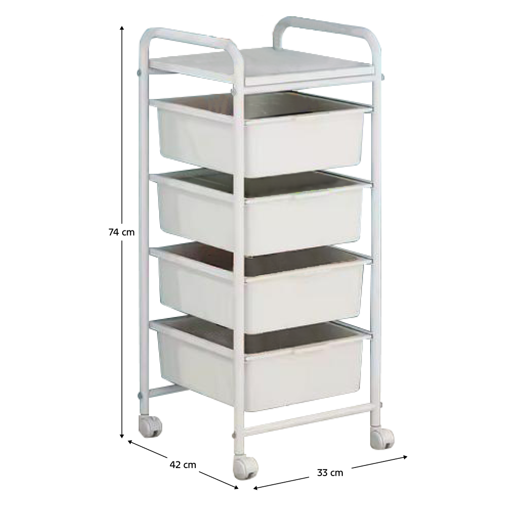 Materiál: železo/MDF/plastFarba: bielaRozmery (ŠxHxV): 33x42x74 cmHrúbka tyče: 1,6 cmŠtyri plastové boxyRozmery boxov (ŠxHxV): 28,5x36x11 cmPolicaNosnosť: 5-10 kgZabezpečená cirkulácia vzduchuPojazdnýNa kolieskachOtočné kolieskaŠtyri kolieskaDve kolieska s brzdamiVýška koliesok: 4 cmModerný dizajnDodávané v demonte