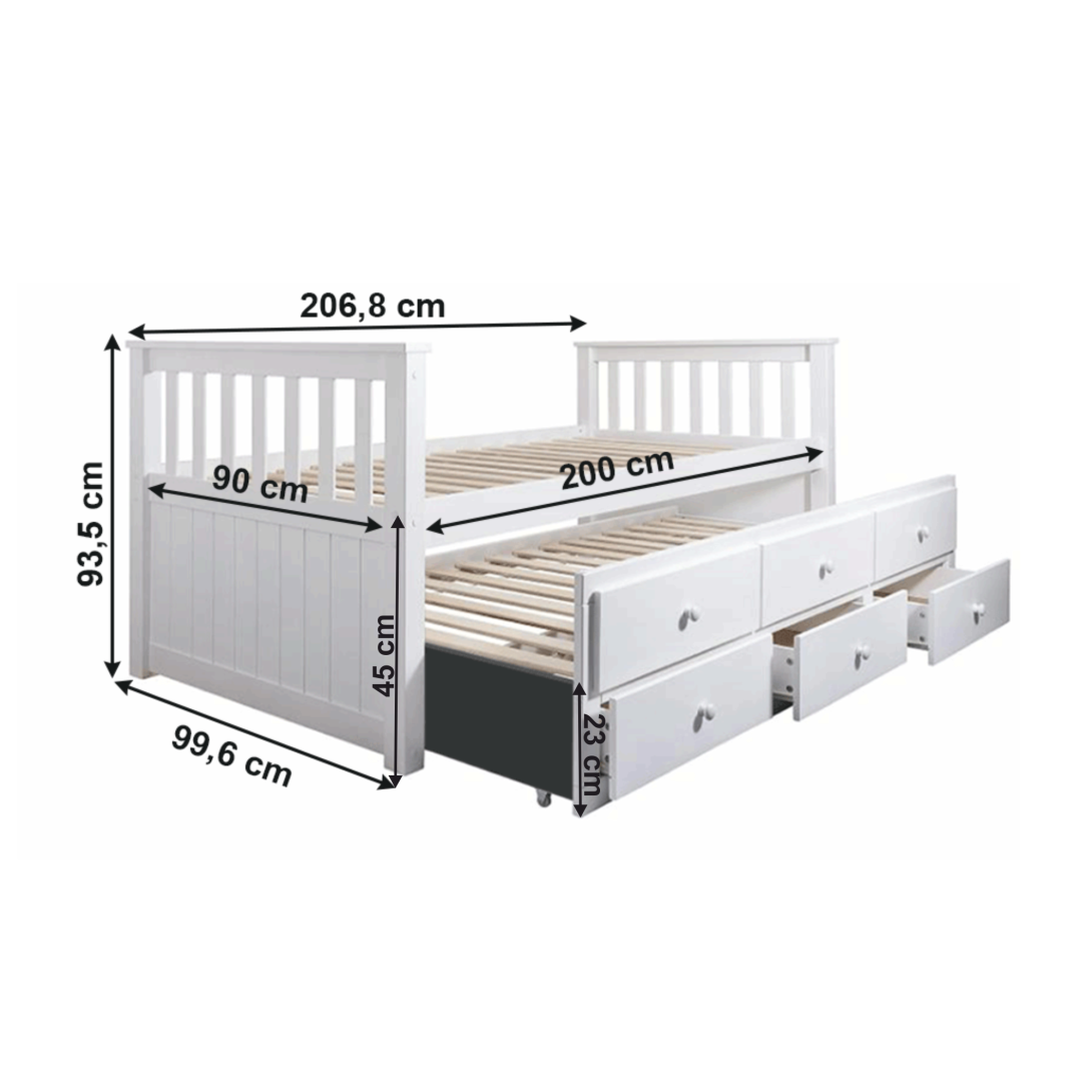 Posteľ s prístelkou a úložným priestorom AUSTIN NEWMateriál: kaučukové drevo/MDF/preglejkaFarba: bielaRozmery (ŠxHxV): 206,8x99,6x93,5 cmRozmery lôžka (ŠxH): 90x200 cmVýška matraca na prístelku max: 12 cmVýška po rošt - prístelka: 23 cmVýška po rošt - horné lôžko: 45 cmNosnosť: 110 kgDodávaná s latkovým roštom.S prístelkouTri šuplíkyDodávané v demonte.