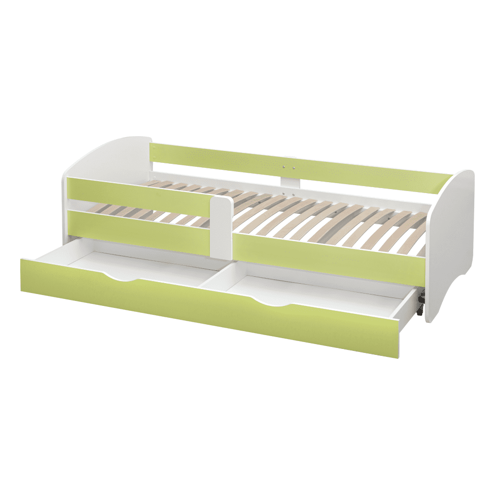 Materiál: laminovaná DTDFarba: biela/zelenáRozmery (ŠxHxV): 205x100x61 cmRozmery spania (ŠxD): 90x200 cmHrúbka materiálu: 1,8 cmMožnosť namontovať zábranu na ľavú alebo pravú stranuModerná a praktickáS úložným priestoromÚložný priestor na kolieskachDva šuplíkyHmotnosť: 55 kgNosnosť: 90 kgDodávaná s lamelovým roštomDodávaná bez matracaMožnosť dokúpiť matrac z našej ponukyDodávaná v demonte