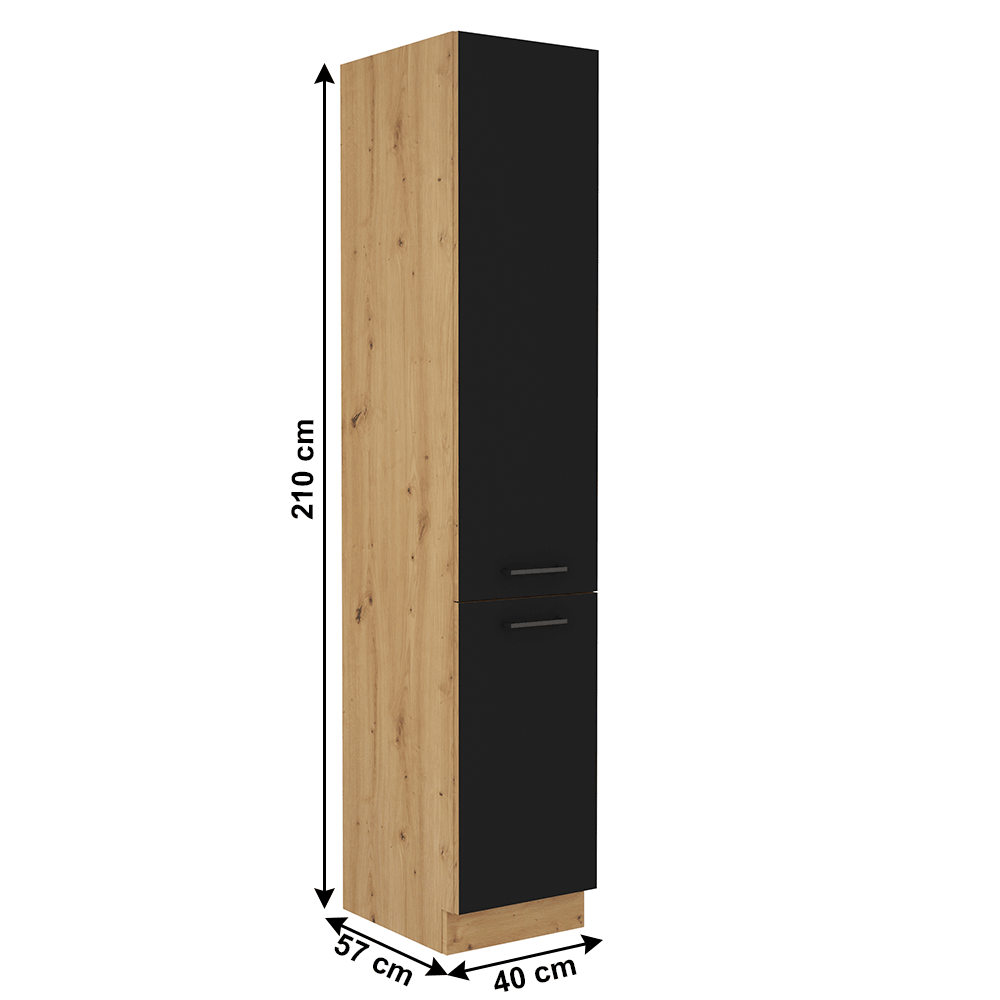 Materiál: laminovaná DTDFarba: čierny mat/dub artisanRozmery (ŠxHxV): 40x57x210 cmHrúbka materiálu: 1,6 cmPotravinováS dvierkamiS úchytkamiÚchytka: 19,2 cmTichý doraz dvierokVnútro skrinky je bieleS dolnou lištou/soklomModerný dynamický dizajnDodávané v demontePracovnú dosku dub artisan s hrúbkou 3,8cm je možné doobjednať za cenu 65 EURMožnosť dokúpiť univerzálny drez LAY ON.
