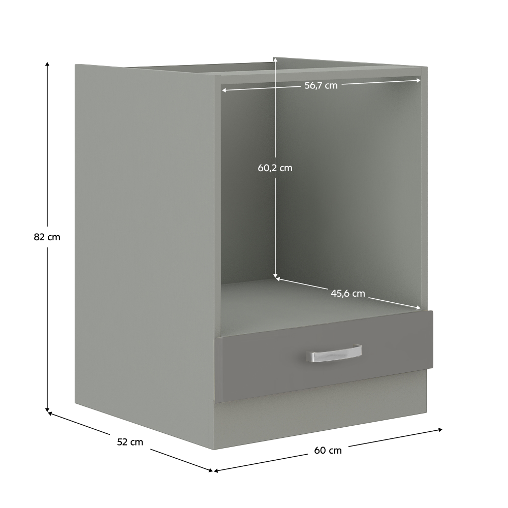 Dolná skrinka, Materiál: DTD laminovaná, Prevedenie: sivý vysoký lesk, Rozmery ŠxVxH: 60x82x52 cm. Vnútorný rozmer (ŠxHxV): 56,7x45,6x60,2 cmJe určená na zakomponovanie sporáka do kuchynskej linky. Dodávané v demonte. Bez pracovnej dosky.Sektorové skrinky sú dodávané bez pracovnej dosky vrátane spodnej lišty. Možnosť dokúpiť PD metalic brown v cene 55 Eur/1m. Možnosť dokúpiť univerzálny Ľ/P drez LAY ON.