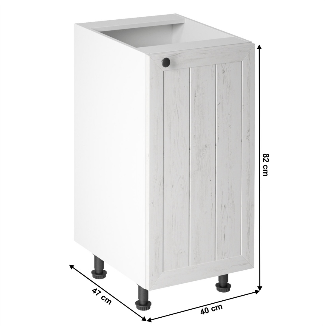 Spodná skrinka s dvierkami a policou, pravá, ku kuchyni PROVANCEPrevedenie: DTD laminovaná/MDFFarba: biela/sosna andersenRozmery (ŠxHxV): 40x47x82 cmHrúbka materiálu: 15 mmSystém tichého zatvárania dvierokCena sektorových skriniek je uvádzaná bez pracovnej dosky a spodnej lišty. Cena za pracovnú dosku dub lancelot je 56 Eur/bm - hrúbka 38 mm, cena za spodnú lištu je 14 Eur. Ku každej dolnej skrinke okrem D25PZ, je potrebné doobjednať 2 ks úchytov na sokel cena 1 Eur/2 ks.