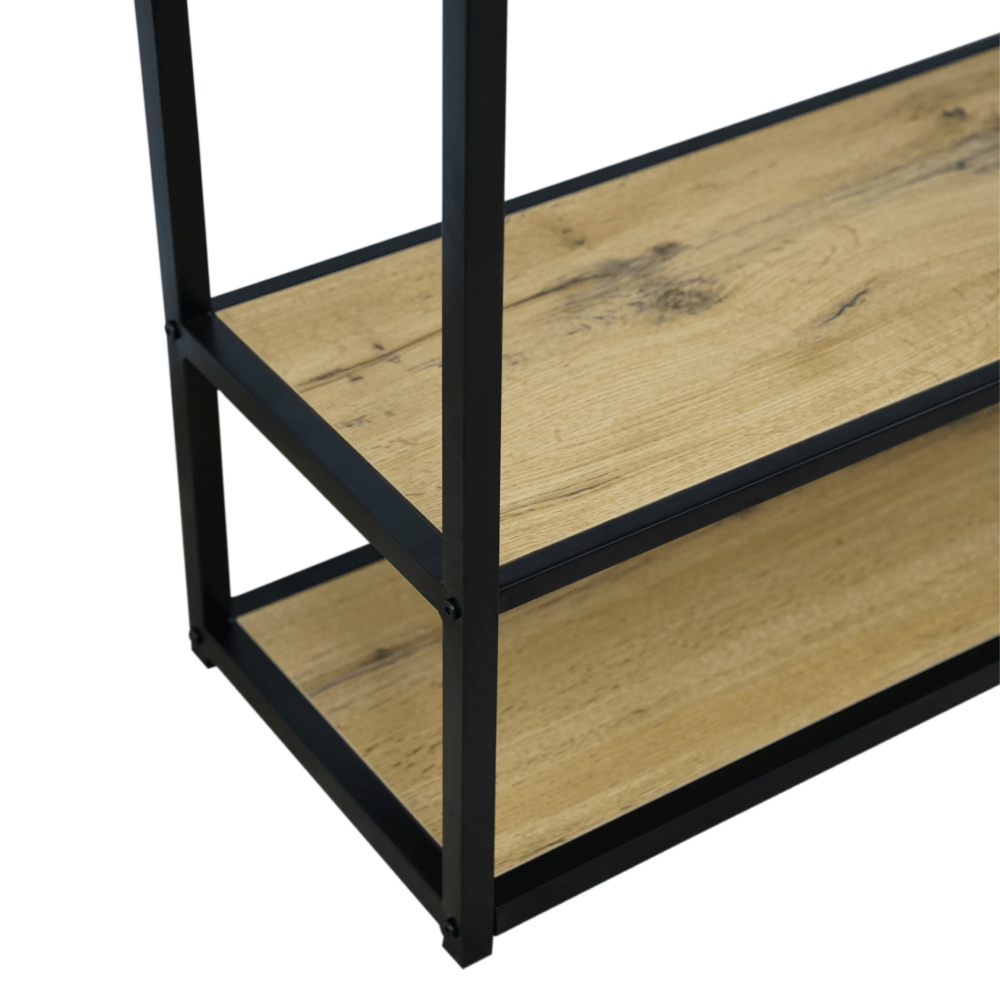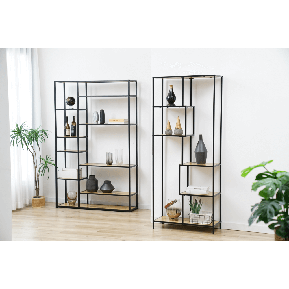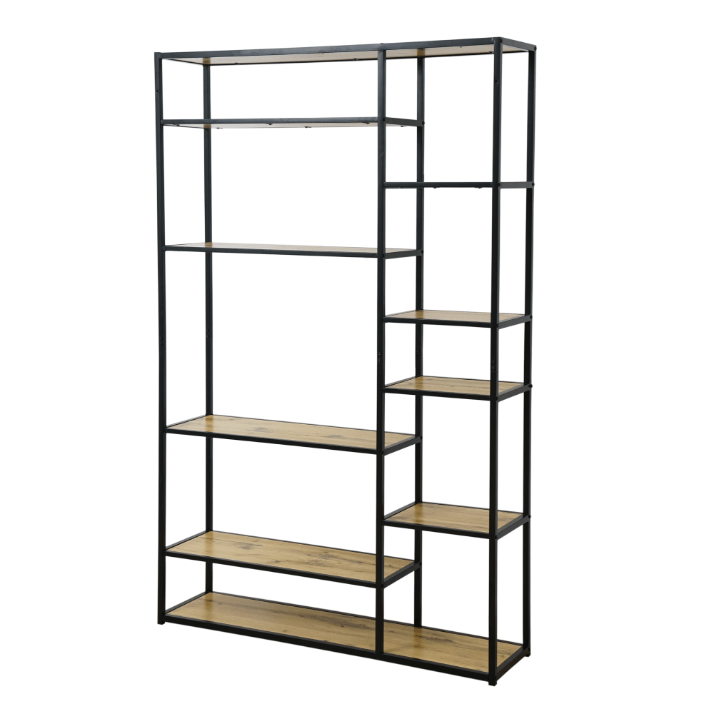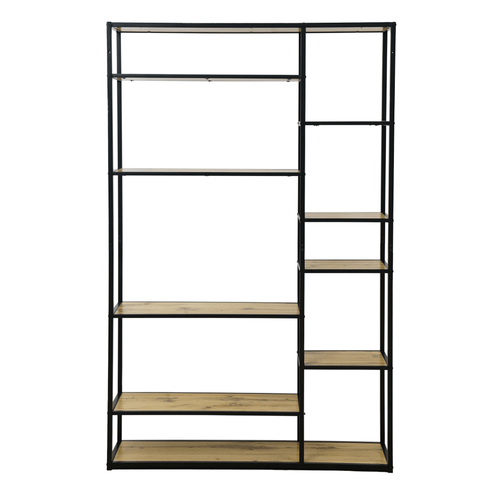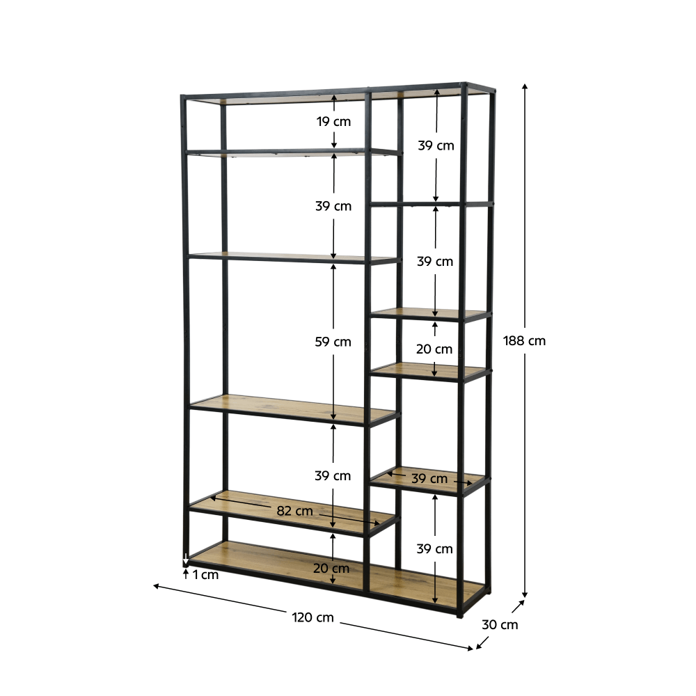 Materiál: kov/MDF laminovanáFarba: čierna/dub Rozmery (ŠxHxV): 120x30x188 cmHrúbka MDF: 1,5 cmVýška nožičiek: 1 cmNosnosť na jednu policu: 10 kgOtvorený úložný priestorDesať odkladacích plôchKovová konštrukciaOdporúčame pripevniť k steneDodávané v demonte