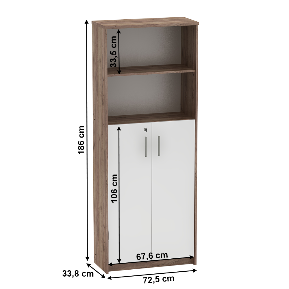 Kancelársky regál so skrinkou na zámok a otvoreným úložným priestorom JOHAN 2 NEW 10Farebné prevedenie: kraft dunkel/bielaMateriál: DTD lamiovanáRozmery (ŠxHxV): 72,5x33,8x186 cm Skrinka s dvierkami na zámokZámok je na dveráchVo vnútri skrinky dve policeRozmery skrinky (ŠxHxV): 67,6x33,8x106 cmOtvorený úložný priestorJedna policaHrúbka vnútorných políc: 1,6 cmNosnosť políc: max 5 kgHrúbka materiálu: 16/22 mm ABS hranySlovenský výrobokDodávané v demonte