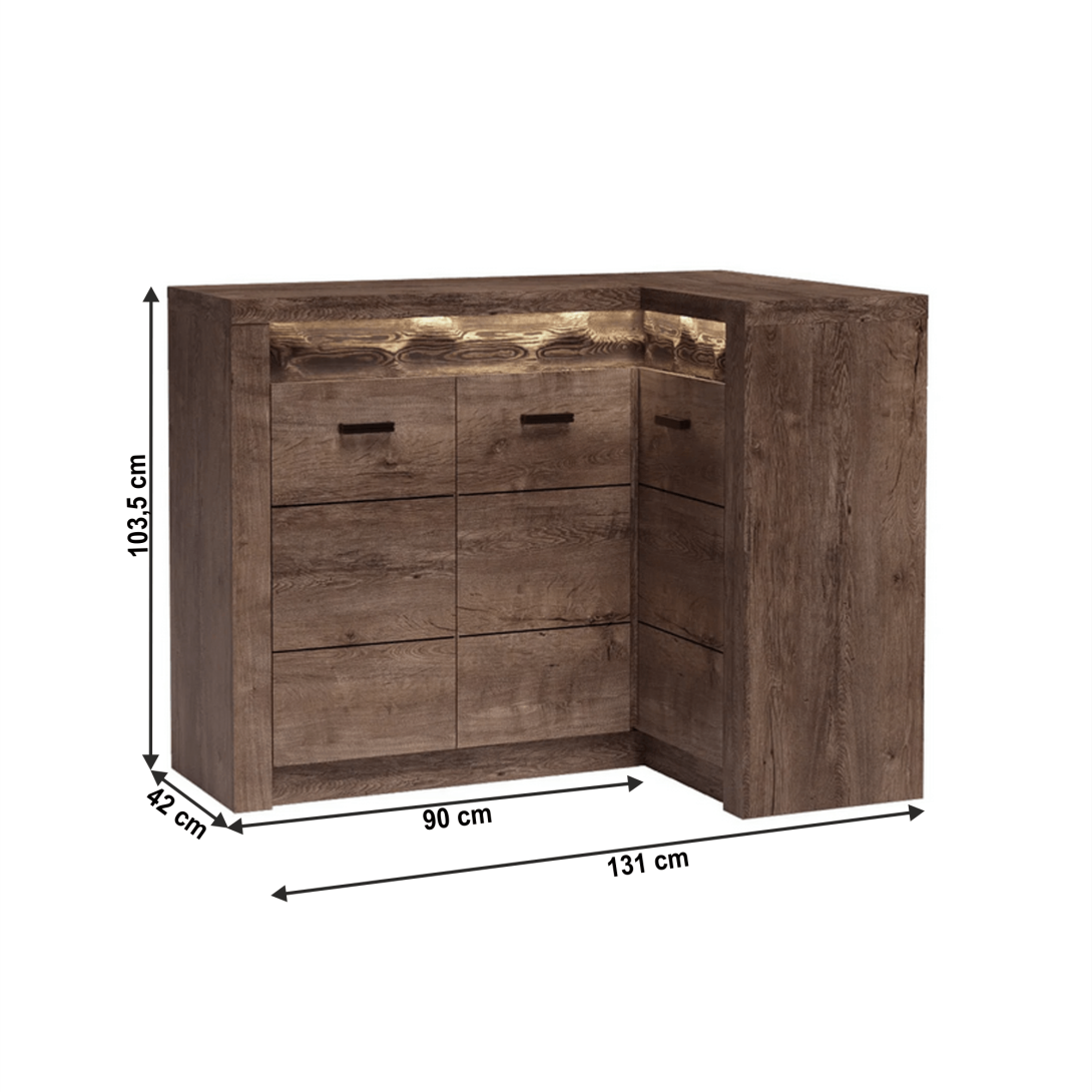 Rohová komoda 15 Korpus hrubý až 48 mm, hrúbka materiálu zvyšné časti: 16 mm, úchytky kovovéMateriál DTD laminovaná, ABS hrany, farebné prevedenie: jaseň tmavý, Rozmery ŠxHxV: 131/90x42x103,5 cm. Možnosť dokúpenia LED osvetlenia v cene 41 eur. Dodávané v demonte.