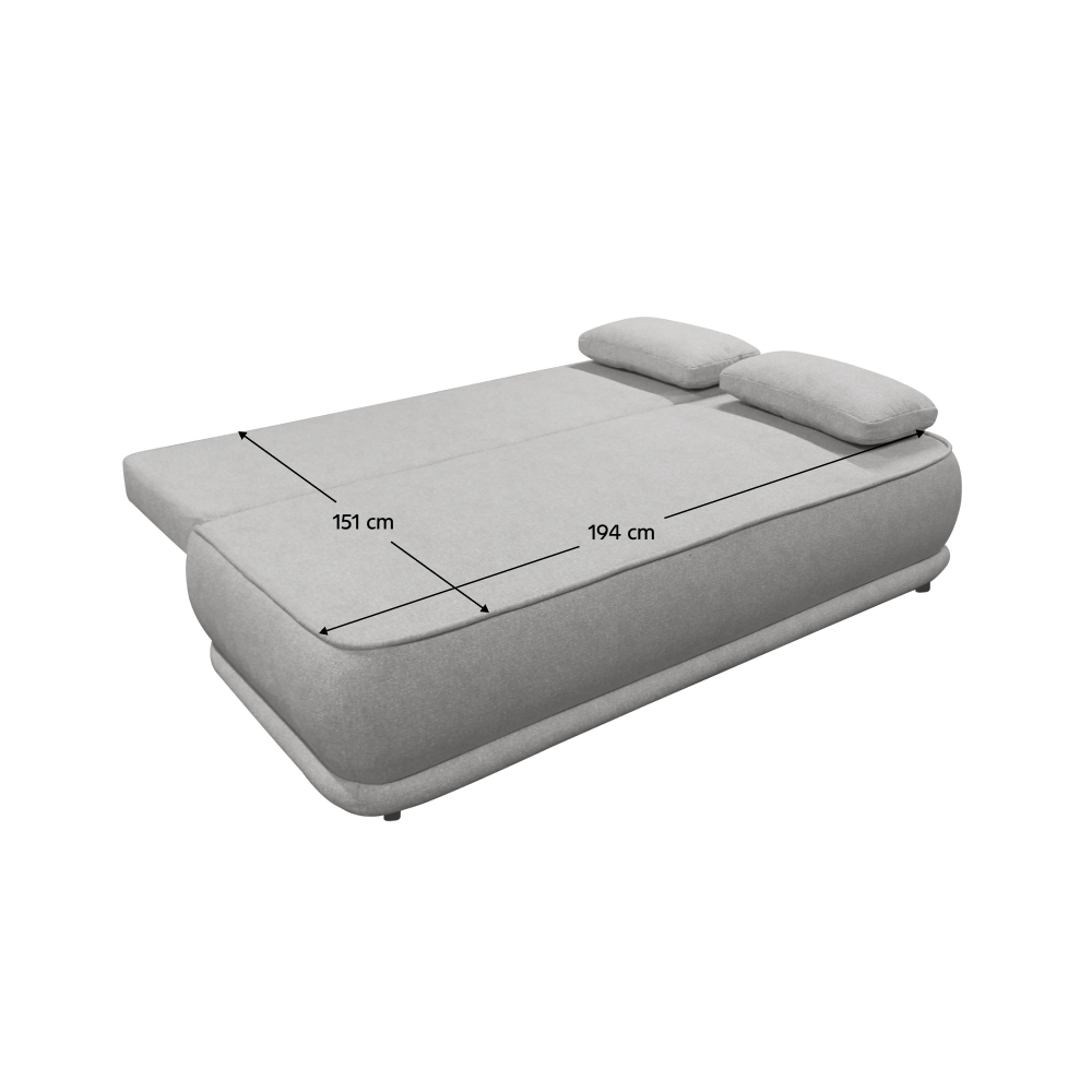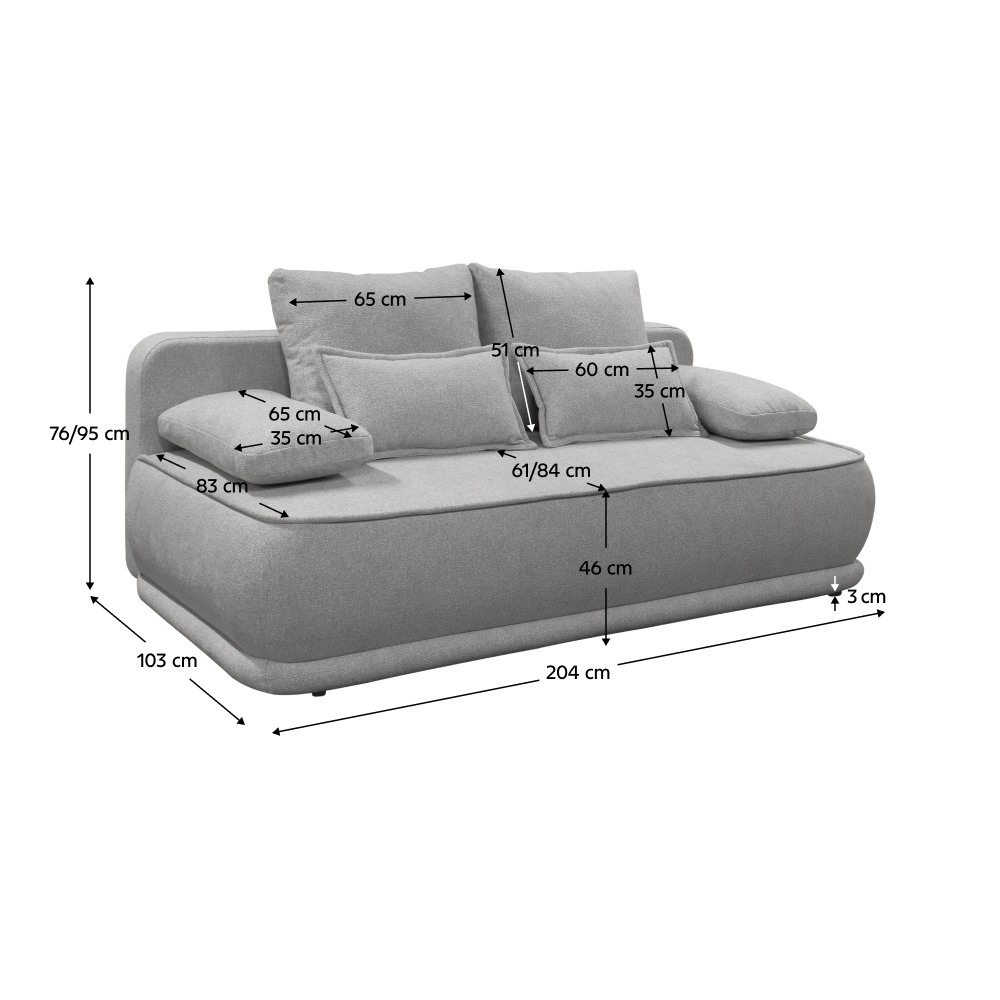 Materiál: látka Blur 18Oderuodolnosť textílie podľa testu Martindale: 50 000 oderovFarba: sivý melírRozmery (ŠxHxV): 204x100x76/95 cmPlocha na spanie (ŠxD): 151x194 cmVýška sedu: 46 cmHĺbka sedu: 45/62/83 cmNosnosť na osobu: 90 kgNa nožičkáchMateriál nožičiek: plastFarba nožičiek: čiernaVýška spodného priestoru od podlahy: 3 cmVýplň: pružina falista/pur penaCeločalúnenáRozkladaciaÚložný priestorDodávaná s vankúšmiRozmery veľkých vankúšov (ŠxV): 62x51 cmRozmery menších vankúšov (ŠxV): 60x35 cmRozmery dekoratívnych vankúšov (ŠxV): 65x35 cmPraktickáModernáDodávané v demonte